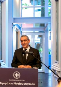 «Σήμερα είναι μια σημαντική μέρα για μας, γιατί σ’ αυτόν τον υπέροχο χώρο, Προξενείο της Ελλάδος στα χρόνια της σκλαβιάς, έναν χώρο με πολύ μεγάλη ιστορία, για μας πολύ βαρύ σε συμβολισμό, έρχεται σήμερα να στεγάσει τις περιόδους αγωνίας και στοιχήματα. Κάθε εποχή έχει το δικό της περιεχόμενο. Τότε, στα χρόνια της σκλαβιάς που τα νησιά ζούσαν με το όνειρο της επιστροφής στην οικογένειά τους, ήταν η ελευθερία, η Δημοκρατία και το να αναπνεύσουν ελεύθερα. Σήμερα με τη Δημοκρατία μας να ωριμάζει, να ενηλικιώνεται σιγά-σιγά, οι προκλήσεις της εποχής είναι το περιβάλλον, το βιοτικό επίπεδο, η ποιότητα ζωής κι αυτές τις σύγχρονες προκλήσεις έρχεται αυτός ο χώρος, ο οποίος πάντα στέγαζε τις αγωνίες της περιόδου, να τις φιλοξενήσει. Δύο Οργανισμοί της Αυτοδιοίκησης, ο ΦοΔΣΑ Νοτίου Αιγαίου και ο Αναπτυξιακός της ΠΝΑΙ, στεγάζονται σ’ αυτό το ιστορικό κτίριο.
