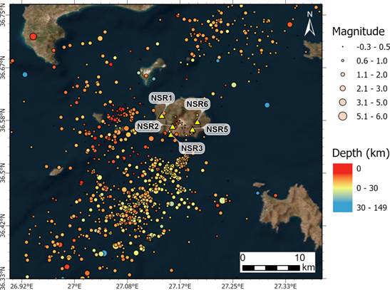 Εικόνα 2. Σεισμικότητα της περιόδου Σεπτεμβρίου 2023 – Ιουνίου 2025 στην ευρύτερη περιοχή της Νισύρου. Τα επίκεντρα απεικονίζονται με κύκλους, με το μέγεθος των συμβόλων να αντιστοιχεί στο μέγεθος του σεισμού και το χρώμα να αντιπροσωπεύει το εστιακό βάθος. Οι σταθμοί του τοπικού σεισμολογικού δικτύου του ΕΚΠΑ απεικονίζονται με κίτρινα τρίγωνα και οι κώδικές τους ονομασίες σημειώνονται με ετικέτες.