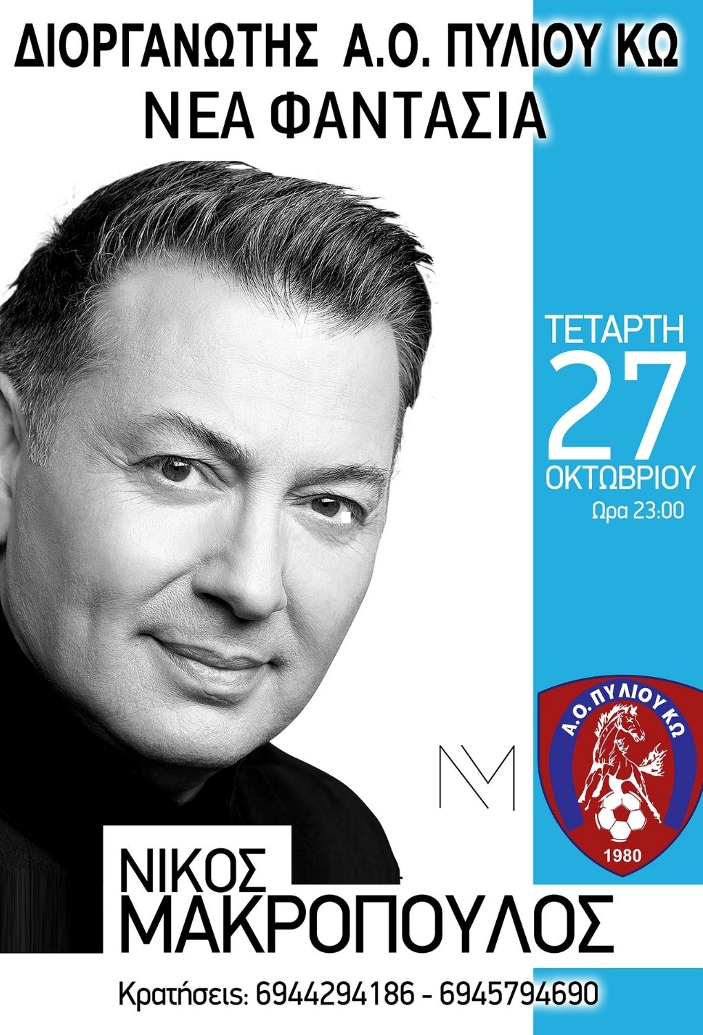 Ο Νίκος Μακρόπουλος έρχεται στην Κω στις 27.10.2021 και ώρα 23:00 στη Νέα Φαντασία, υπό την αιγίδα και την επιμέλεια του ΑΟ Πυλίου Κω, για μια απολαυστική βραδιά αφιερωμένη σε όλους μας. Με τη φωνή του έχουμε αγαπήσει, χαμογελάσει και ζήσει ανεπανάληπτες στιγμές.