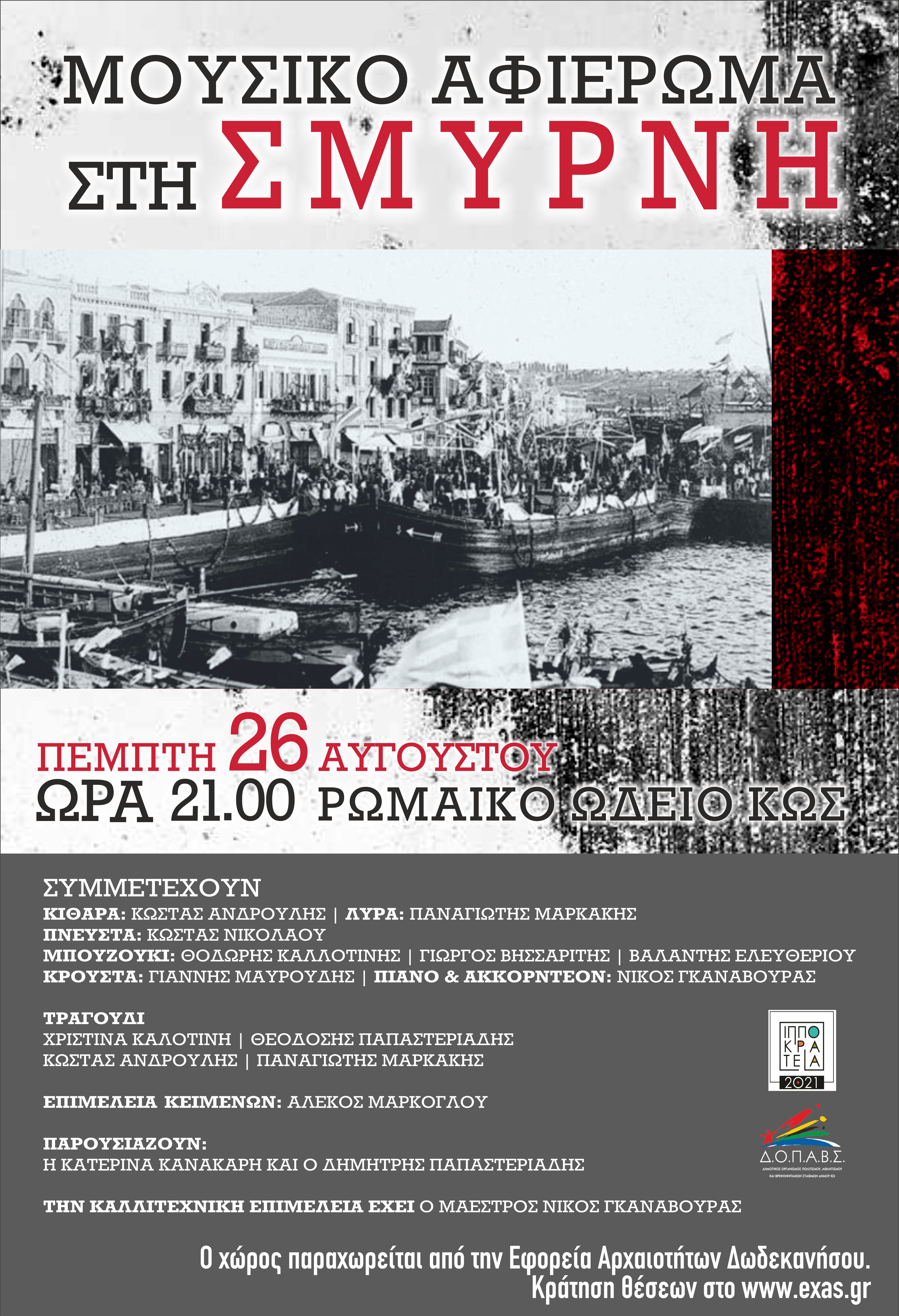 Ο Δ.Ο.Π.Α.Β.Σ. και η Λαϊκή Ορχήστρα της Δημοτικής Ενότητας Ηρακλειδών υπό την καλλιτεχνική διεύθυνση του Μαέστρου και Αρχιμουσικού κ. Νικόλαου Γκαναβούρα στα πλαίσια των Θερινών Ιπποκρατείων 2021 παρουσιάζουν συναυλία- αφιέρωμα στη Σμύρνη την Πέμπτη 26 Αυγούστου 2021 και ώρα 21:00 στο Ρωμαϊκό Ωδείο.