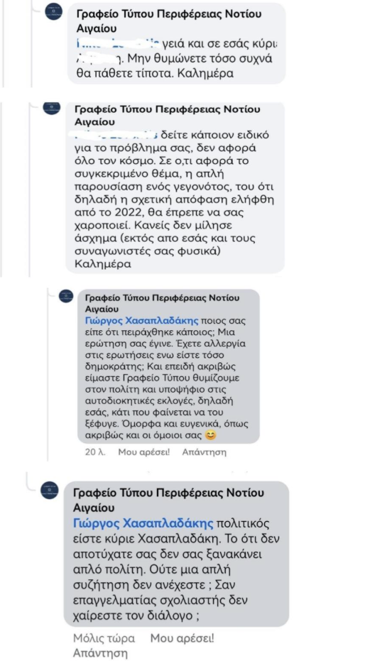 Κι όμως, το τελευταίο διάστημα, η επίσημη σελίδα του Γραφείου Τύπου της Περιφέρειας Νοτίου Αιγαίου εμφανίζεται να απαντά σε πολίτες, αιρετούς και μη, με ύφος ειρωνικό, προσβλητικό, προκλητικό και διχαστικό σαν τρολ του διαδικτύου.