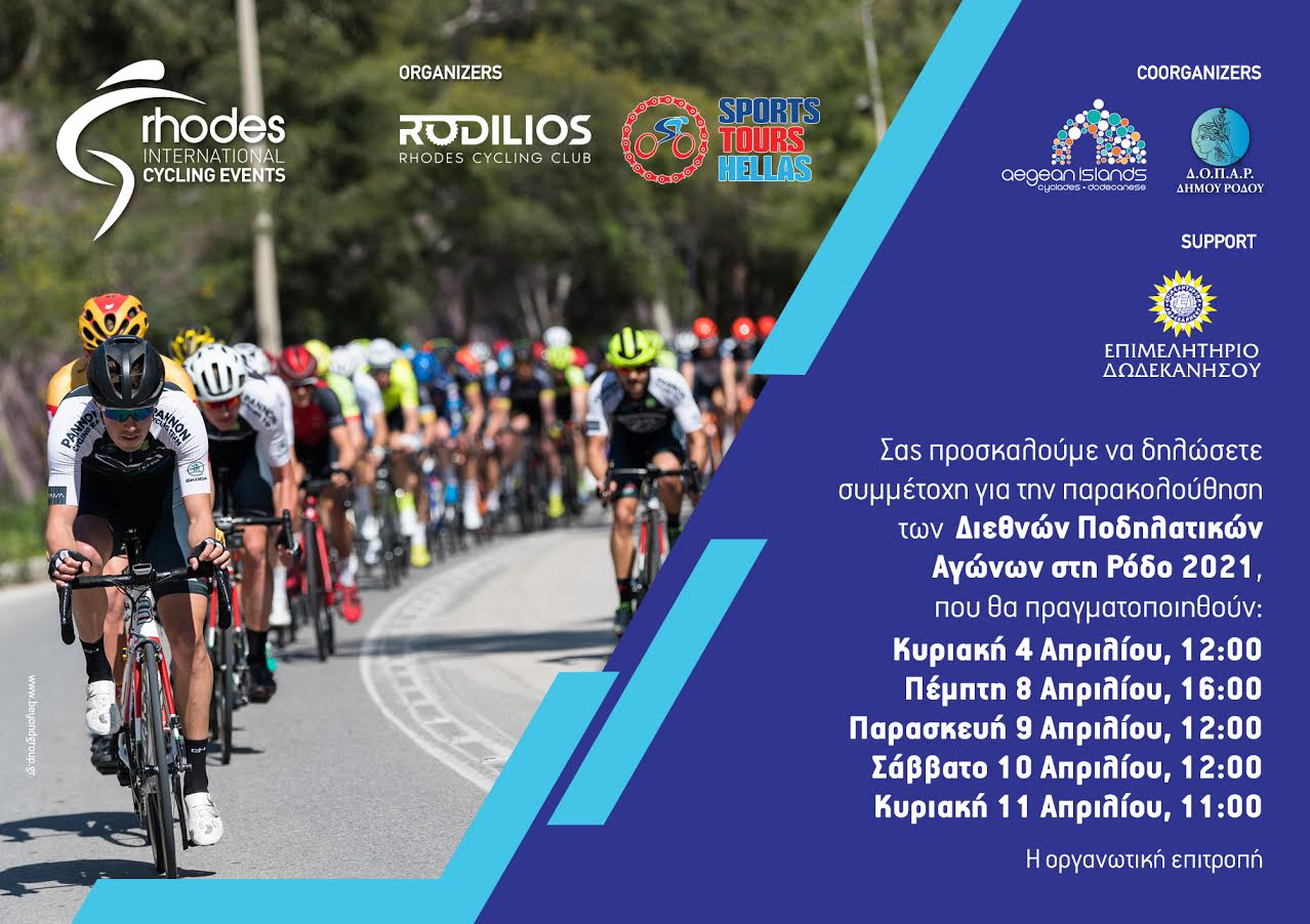 Η αντίστροφη μέτρηση, για τις μεγάλους διεθνείς ποδηλατικούς αγώνες 2021, έχει ξεκινήσει στη Ρόδο. Οι διοργανωτές πλέον μετρούν αντίστροφα για τα μεγάλα ποδηλατικά ραντεβού, που θα γίνουν στο νησί μας, στις 4, 8, 9, 10 και 11 Απριλίου. Η Rhodes International Cycling Events, o Ροδήλιος και η Sports Tours Hellas προετοιμάζονται πυρετωδώς για έναν άκρως… ποδηλατικό Απρίλιο, με διοργανώσεις που θα μείνουν χαραγμένες στη μνήμη των συμμετεχόντων. Συνδιοργανωτές είναι η Περιφέρεια Νοτίου Αιγαίου και ο Δήμος Ρόδου (Δ.Ο.Π.Α.Ρ.), με τη στήριξη του Επιμελητηρίου Δωδεκανήσου. Έτσι έχουν προγραμματιστεί να διεξαχθούν οι αγώνες, που κάθε χρόνο κεντρίζουν το ενδιαφέρον του κόσμου και φυσικά όσων συμμετέχουν.