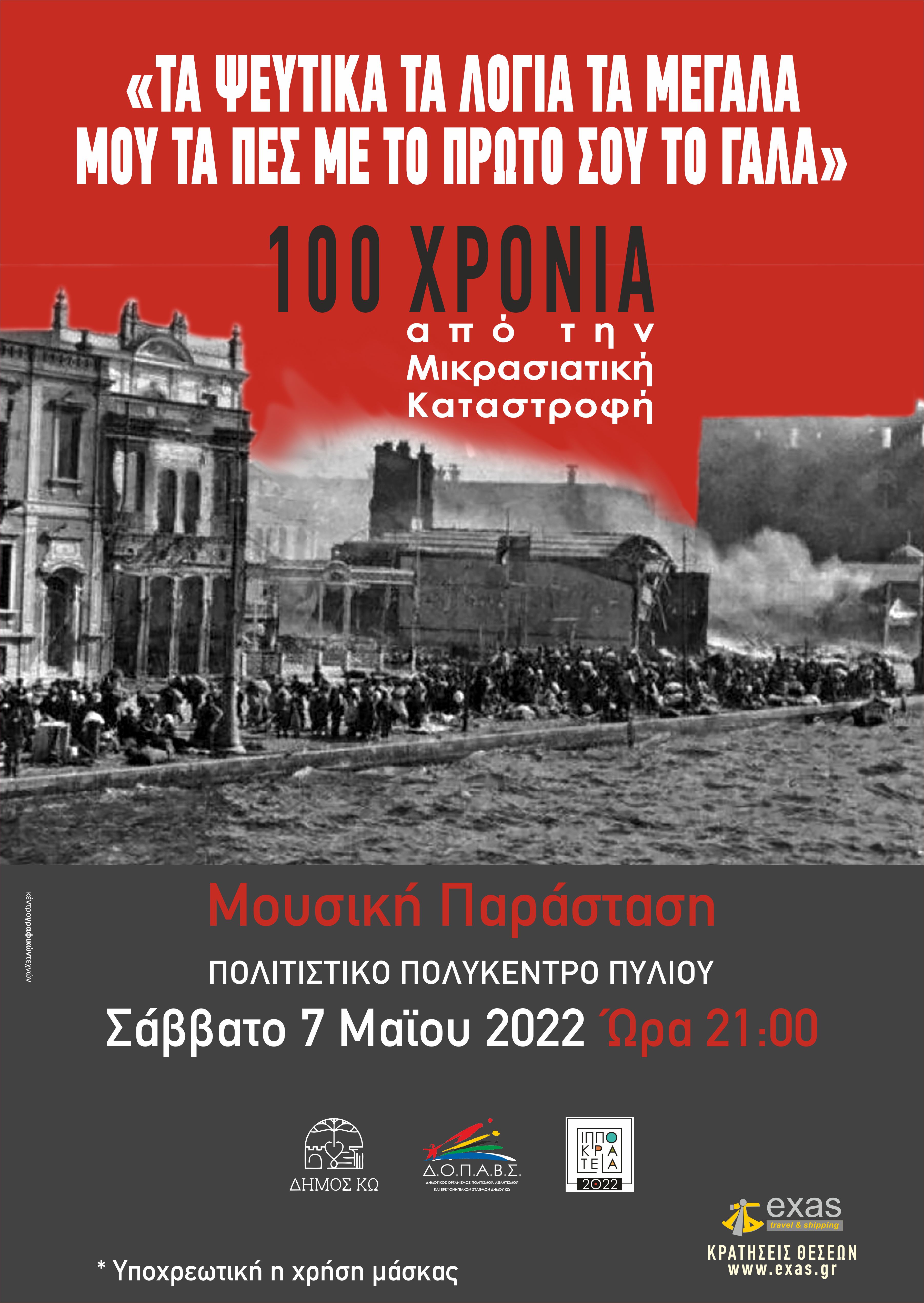 Ο Δ.Ο.Π.Α.Β.Σ. στα πλαίσια των Πολιτιστικών εκδηλώσεων 2022 παρουσιάζει Μουσικοθεατρική παράσταση αφιερωμένη στην Επέτειο των 100 χρόνων από την Μικρασιατική Καταστροφή με τίτλο «Τα ψεύτικα τα λόγια τα μεγάλα μου τα πες με το πρώτο σου το γάλα» το Σάββατο 07 Μαΐου και ώρα 21:00 στο Πολιτιστικό Πολύκεντρο Πυλίου.