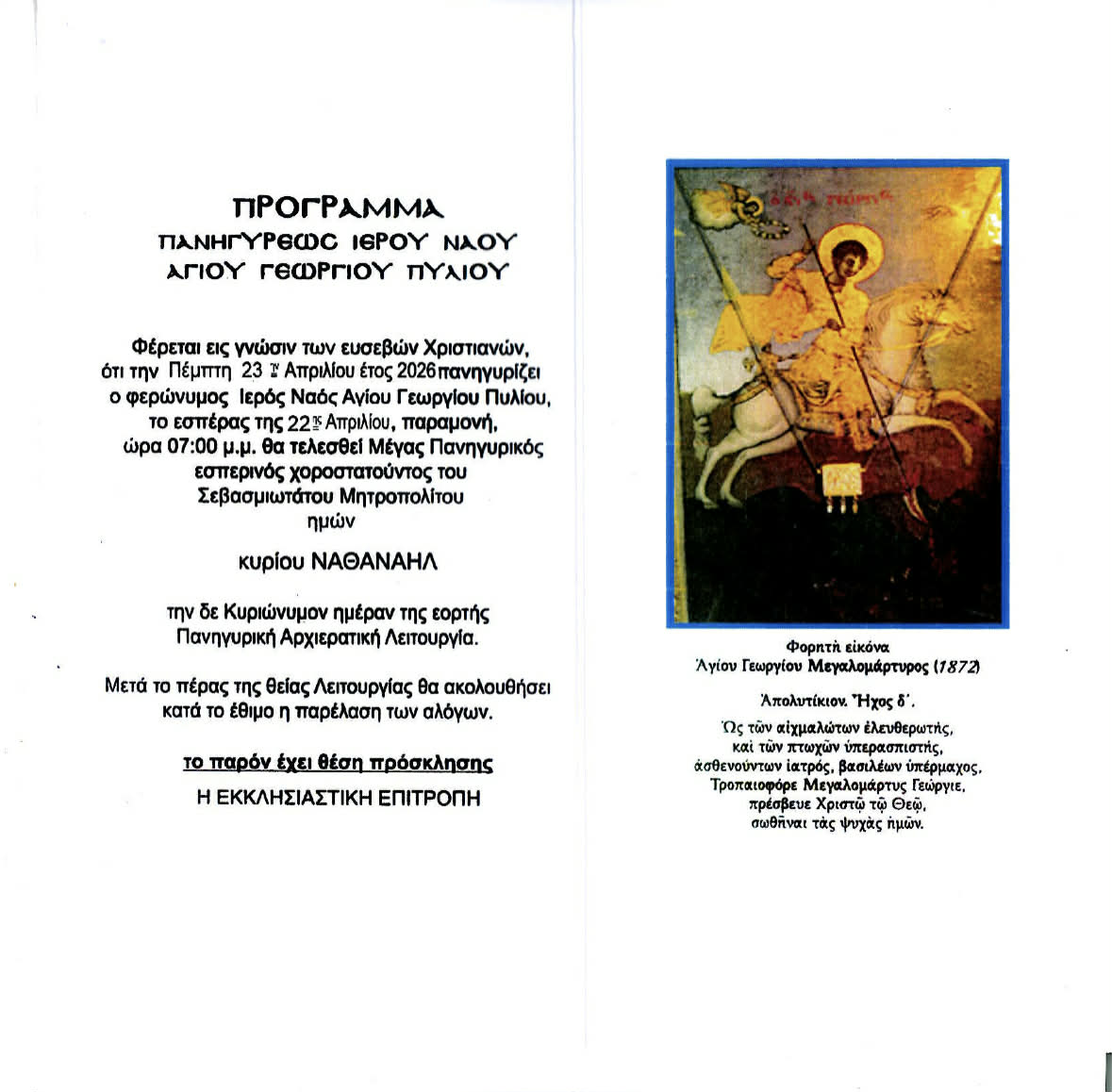 Σύμφωνα με το πρόγραμμα της πανηγύρεως του Ιερού Ναού Αγίου Γεωργίου Πυλίου, την Τετάρτη 22 Απριλίου 2026, παραμονή της εορτής, στις 19:00 θα τελεστεί ο Μέγας Πανηγυρικός Εσπερινός, χοροστατούντος του Σεβασμιωτάτου Μητροπολίτη κ. Ναθαναήλ. Την κυριώνυμη ημέρα, Πέμπτη 23 Απριλίου, θα πραγματοποιηθεί η Πανηγυρική Αρχιερατική Θεία Λειτουργία.