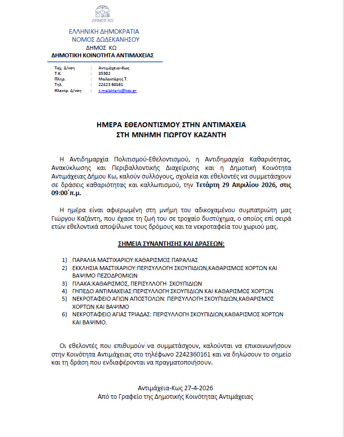 Η Αντιδημαρχία Πολιτισμού-Εθελοντισμού, η Αντιδημαρχία Καθαριότητας, Ανακύκλωσης και Περιβαλλοντικής Διαχείρισης και η Δημοτική Κοινότητα Αντιμάχειας Δήμου Κω, καλούν συλλόγους, σχολεία και εθελοντές να συμμετάσχουν σε δράσεις καθαριότητας και καλλωπισμού, την Τετάρτη 29 Απριλίου 2026, στις 09:00 π.μ.