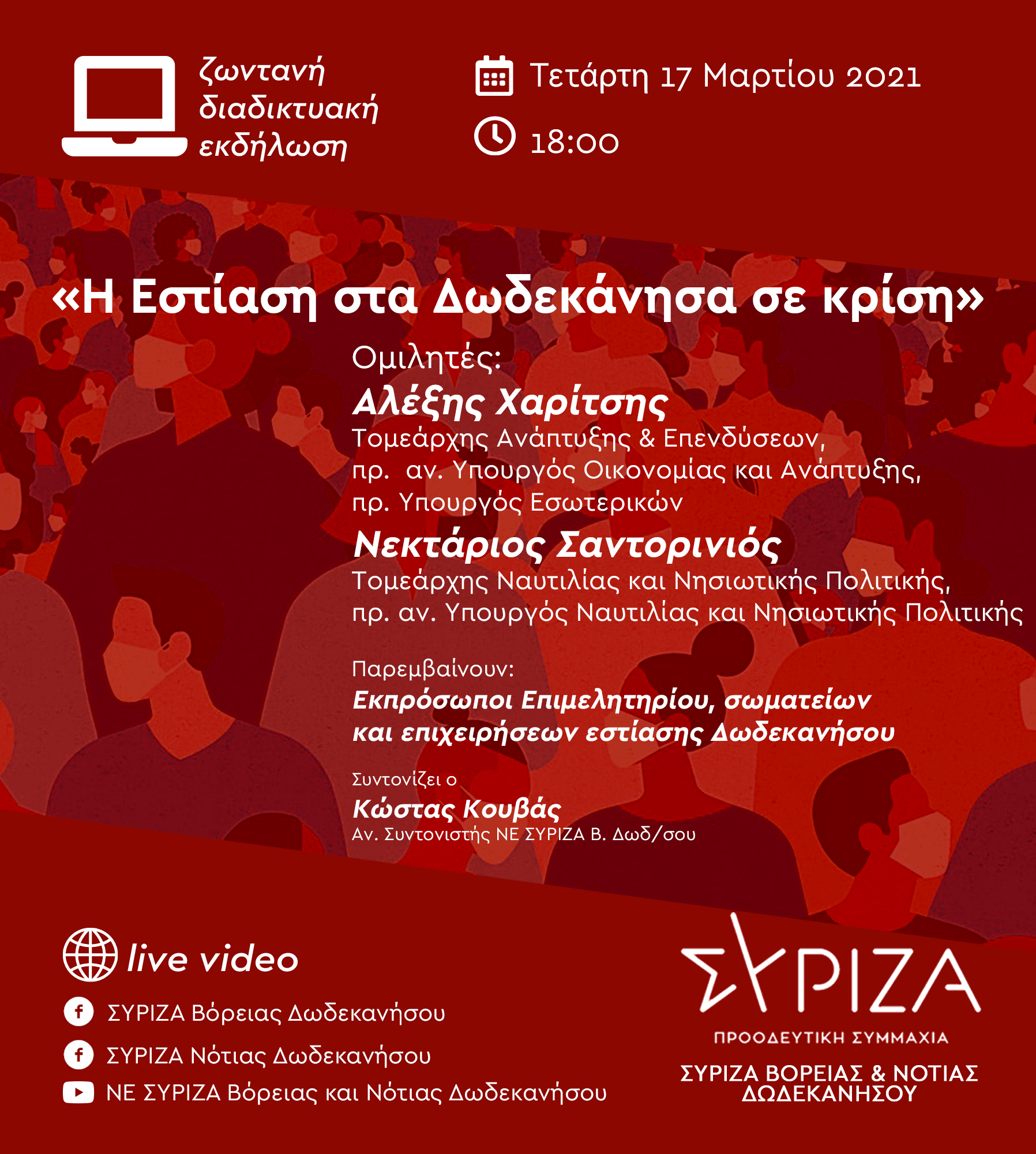 Οι ΝΕ ΣΥΡΙΖΑ Βόρειας και Νότιας Δωδεκανήσου διοργανώνουν διαδικτυακή εκδήλωση για με θέμα «Η Εστίαση στα Δωδεκάνησα σε κρίση» την Τετάρτη 17 Μαρτίου 2021 και ώρα 18:00.