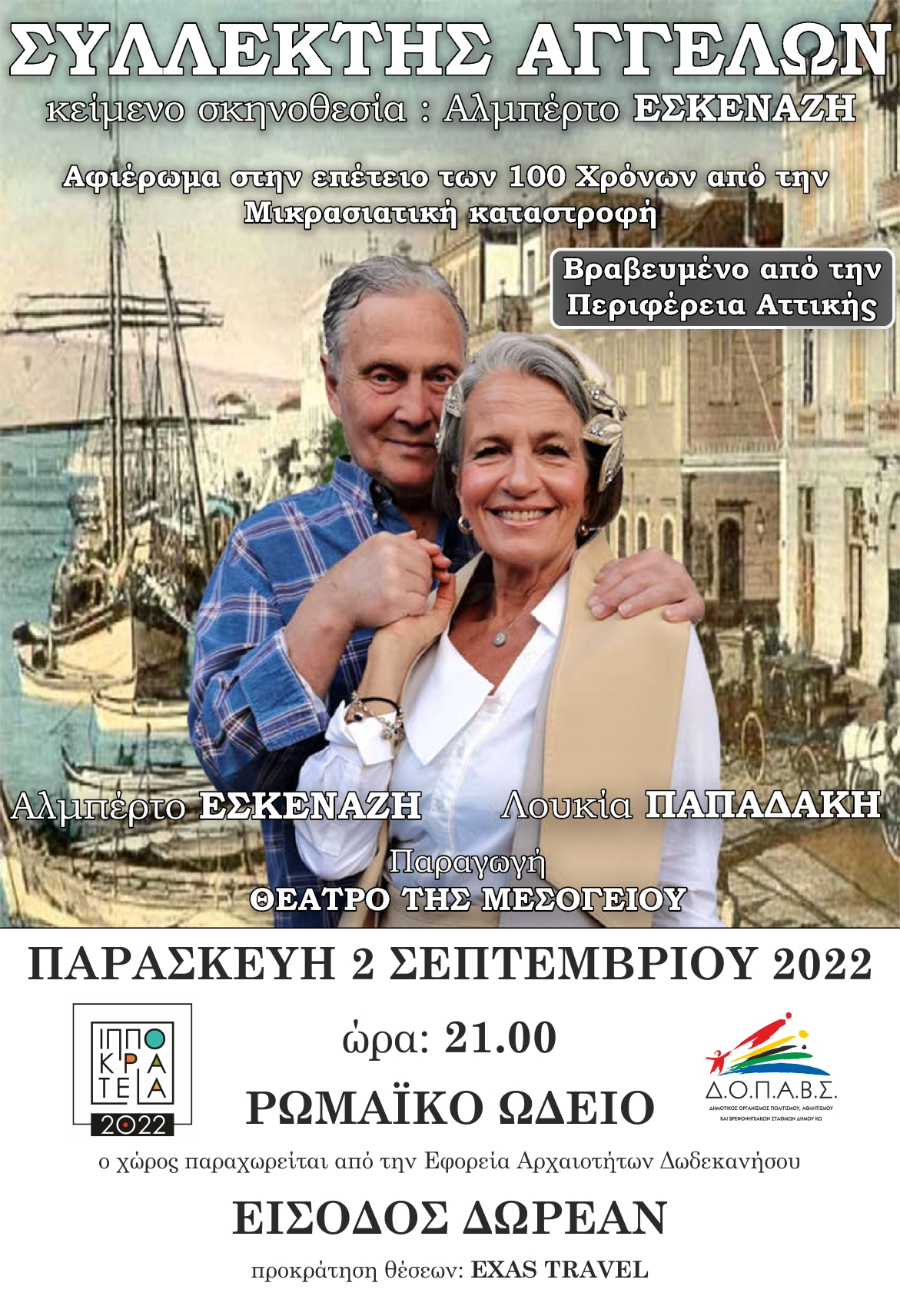 Το Θέατρο της Μεσογείου και ο ΔΟΠΑΒΣ στο πλαίσιο των Θερινών Ιπποκρατείων 2022 παρουσιάζουν την Θεατρική παράσταση «Συλλέκτης Αγγέλων» με τον Αλμπέρτο Εσκενάζη και την Λουκία Παπαδάκη την Παρασκευή 02 Σεπτεμβρίου στις 21:00 στο Ρωμαϊκό Ωδείο. Η παράσταση είναι ένα αφιέρωμα στην επέτειο μνήμης των 100 χρόνων από την Μικρασιατική Καταστροφή και έχει βραβευτεί από την Περιφέρεια Αττικής.