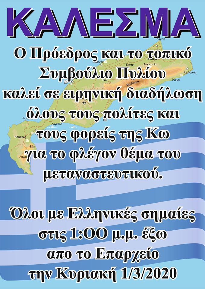 Σχετικά με την  ειρηνική διαδήλωση προγραμματίζεται για αυτή την Κυριακή.  Ο πρόεδρος της τοπικής κοινότητας Πυλίου Θοδωρής Πάχος και το τοπικό συμβούλιο καλεί όλους τους πολίτες σε μία ειρηνική διαμαρτυρία για το μεταναστευτικό την Κυριακή 1η Μαρτίου στη 1 το μεσημέρι στο λιμάνι. Σημείο συνάντησης το επαρχείο Κω. Θα γίνει μία ειρηνική πορεία μέχρι τα δελφίνια. Καλούνται όλοι οι πολίτες του νησιού να δώσουν το παρόν κρατώντας σημαίες ελληνικές και έχοντας ειρηνική διάθεση.