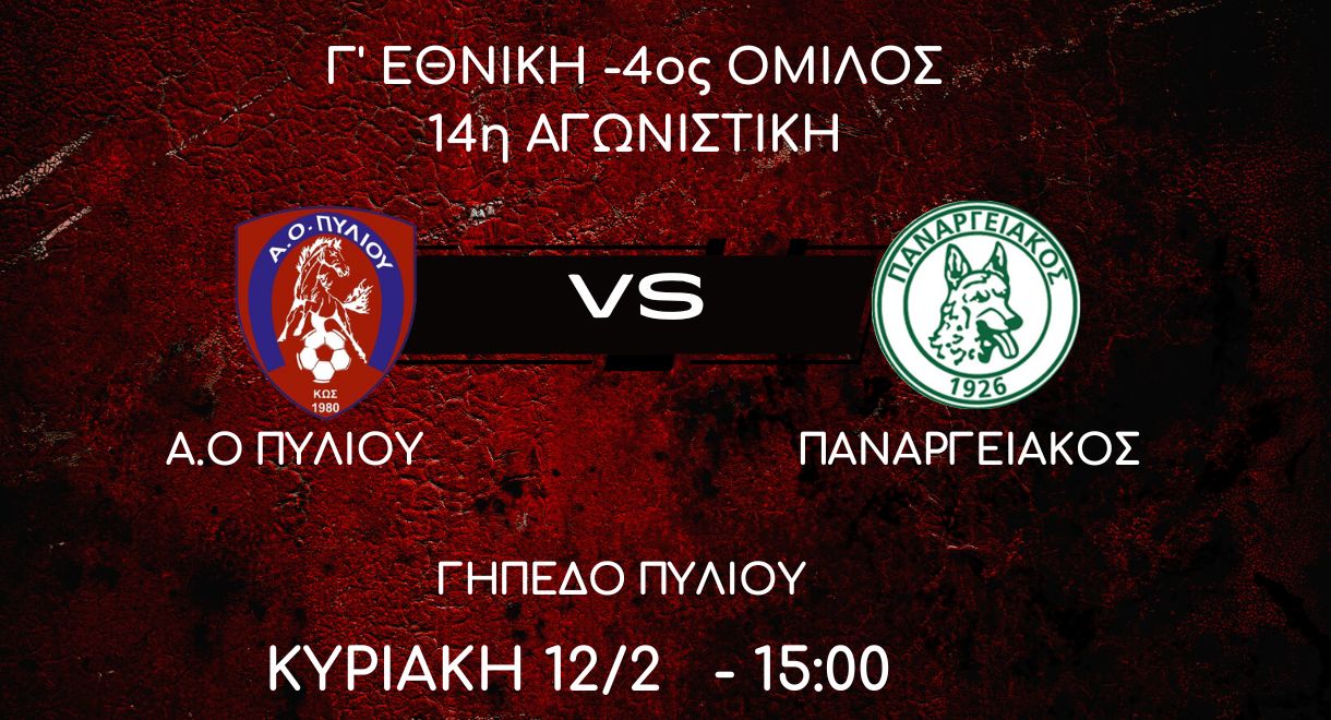 O A.O Πυλίου καλεί τον φίλαθλο κόσμο να δώσει το παρών στην αναμέτρηση για την 14η αγωνιστική της Γ’ Εθνικής (4ος Όμιλος) όπου η ομάδα μας στο πρώτο ματς για τον δεύτερο γύρο υποδέχεται την Κυριακή στις 15:00 στο γήπεδο Πυλίου τον Παναργειακό.