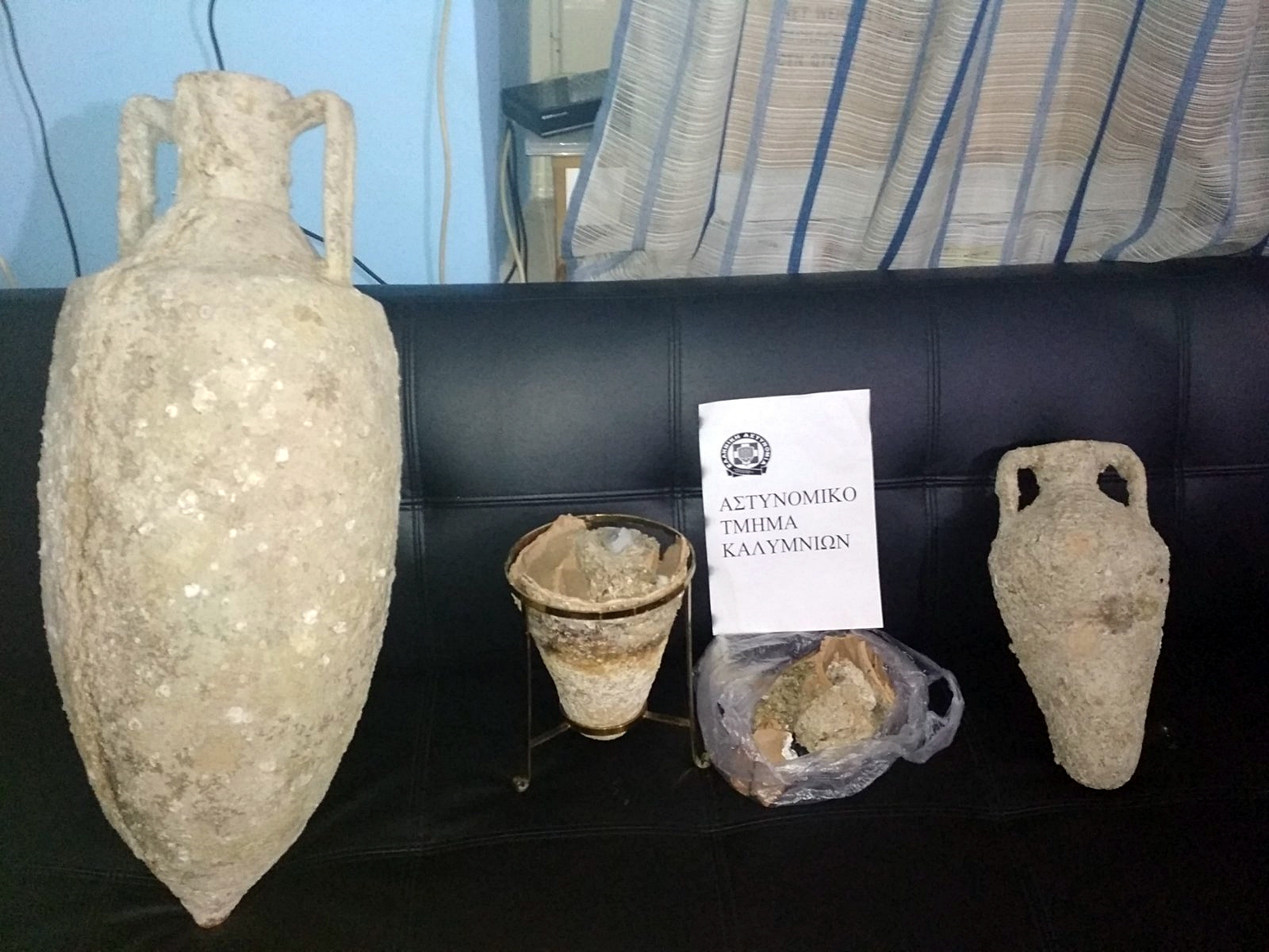 Την 26-03-2021 το πρωί συνελήφθη στην Κάλυμνο, από αστυνομικούς του Αστυνομικού Τμήματος Καλυμνίων, 52χρονη ημεδαπή γιατί έπειτα από έρευνα που έγινε στην κατοικία της βρέθηκαν τρία αρχαία αντικείμενα (αμφορείς), τα οποία εκτιμάται ότι ανήκουν στην ελληνιστική και βυζαντινή περίοδο.