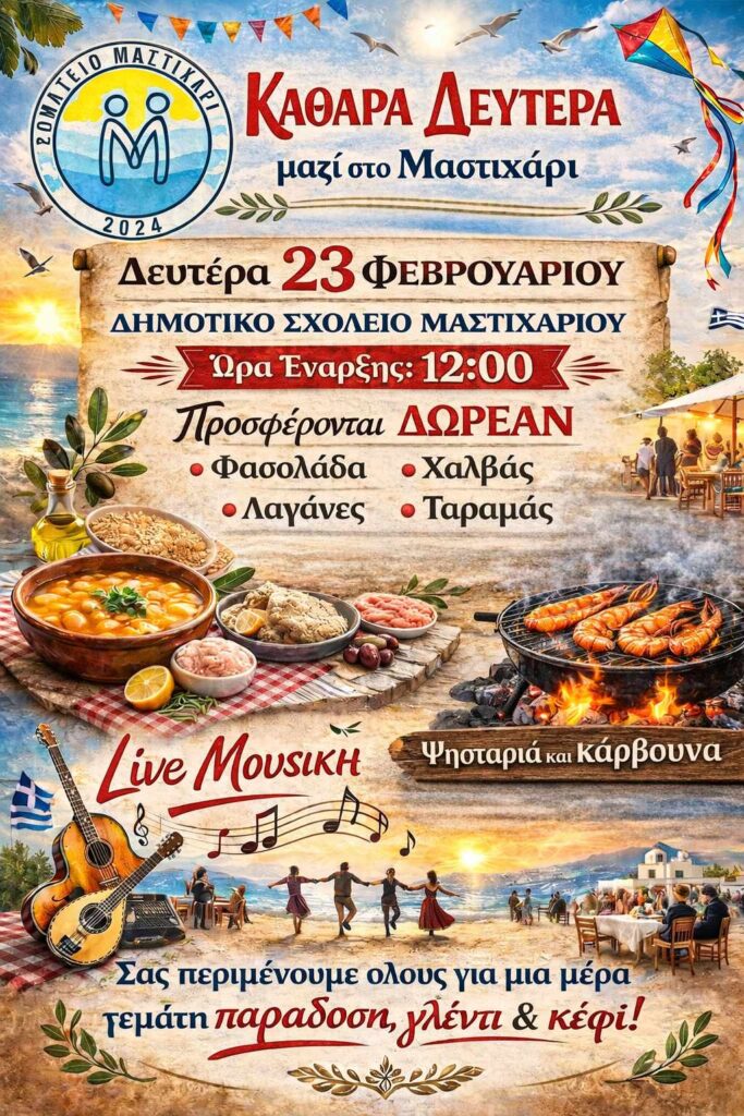 Το Σωματείο Μαστιχάρι «ΔΡΑΣΙΣ» σας προσκαλεί να γιορτάσουμε μαζί την Καθαρά Δευτέρα, αναβιώνοντας τα όμορφα έθιμα του τόπου μας, με κέφι, μουσική και παραδοσιακές γεύσεις!