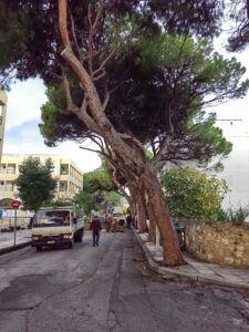 Η αφαίρεση των δύο πεύκων έχει κριθεί επιβεβλημένη (α.α. 529380), λόγω επικίνδυνα μεγάλης κλίσης των κορμών και αστάθειας του επιφανειακού ριζικού συστήματος τους (όπου έχει ανασηκώσει άσφαλτο κα πλάκες πεζοδρομίου), το οποίο τραυματίζεται από τα διερχόμενα οχήματα.