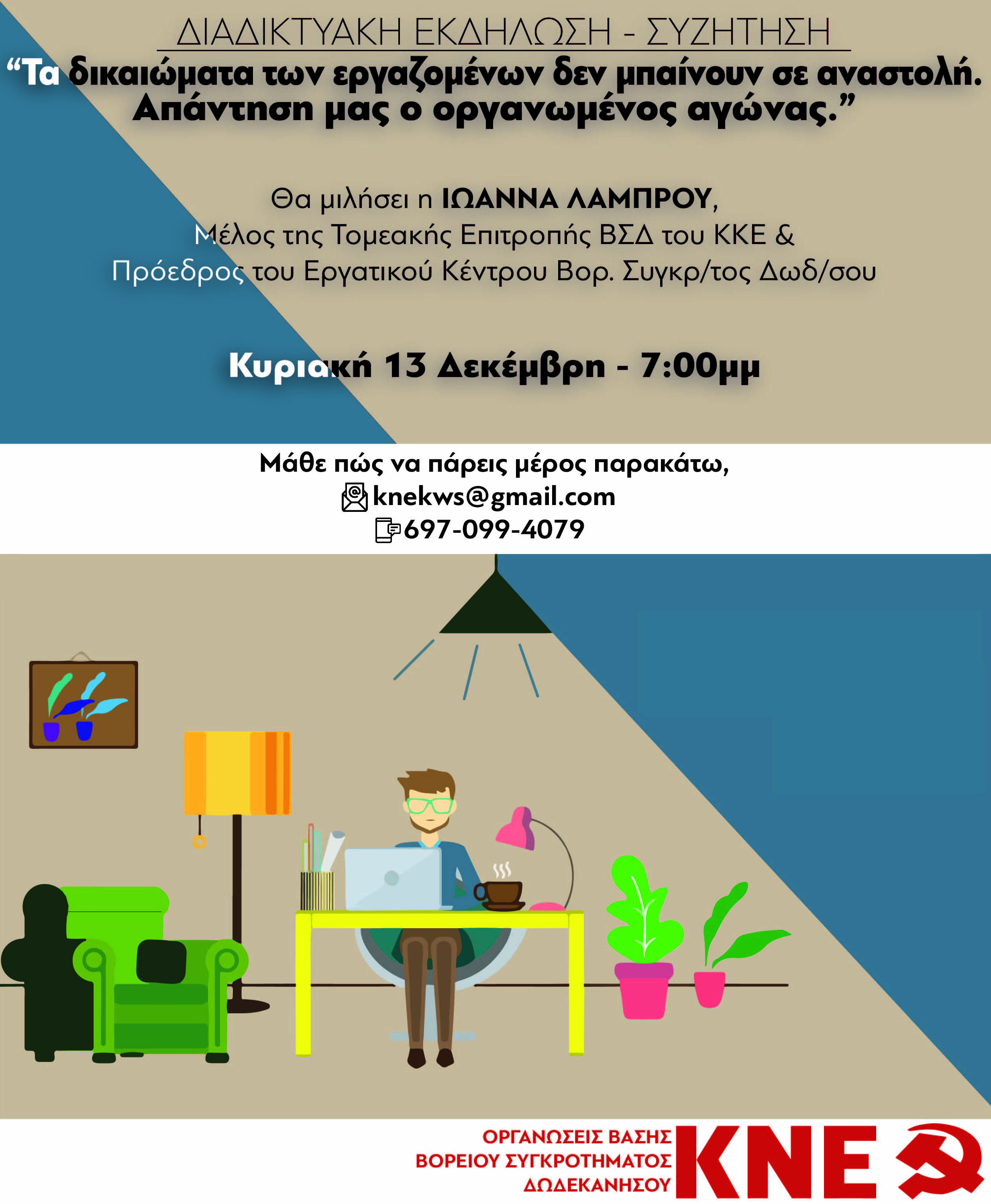 Οι Οργανώσεις Βάσης Βορείου Συγκροτήματος Δωδεκανήσου της ΚΝΕ διοργανώνουν διαδικτυακή εκδήλωση/συζήτηση με θέμα “Τα δικαιώματα των εργαζομένων δεν μπαίνουν σε αναστολή. Απάντηση μας ο οργανωμένος αγώνας”, την Κυριακή 20 Δεκέμβρη, στις 7:00μμ, μέσω της πλατφόρμας jit.si.