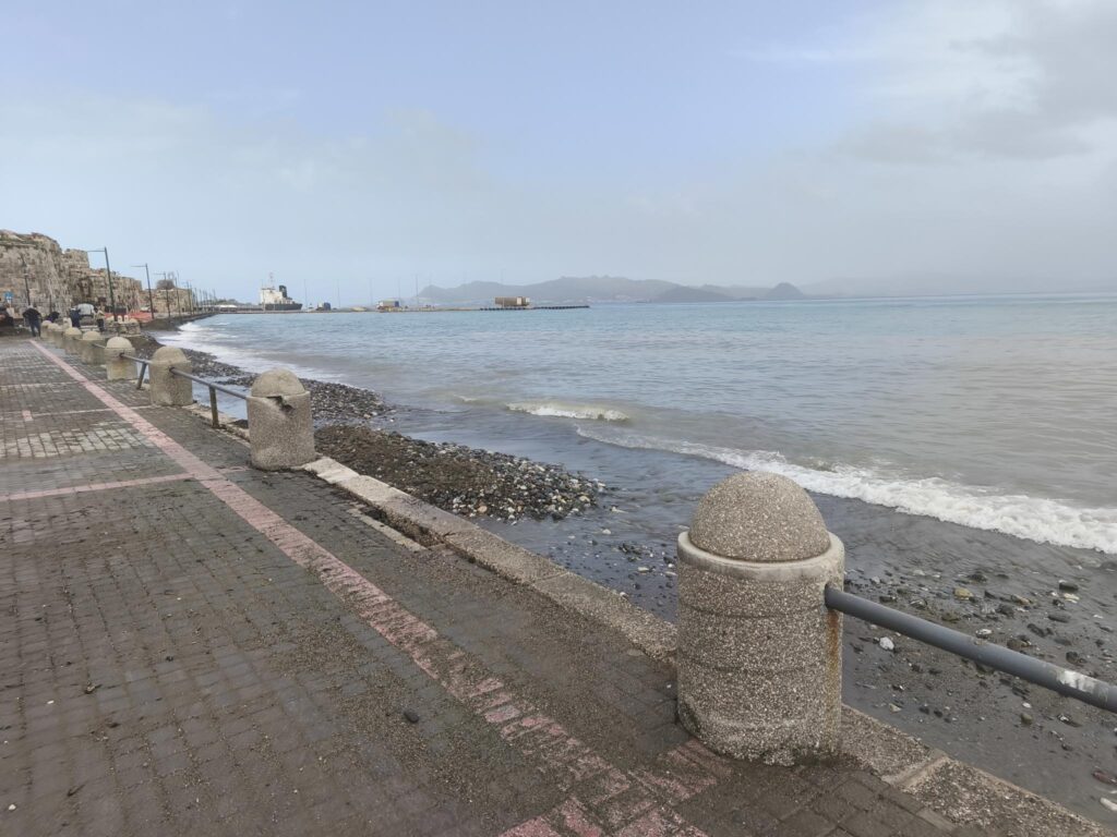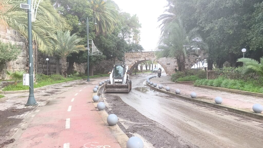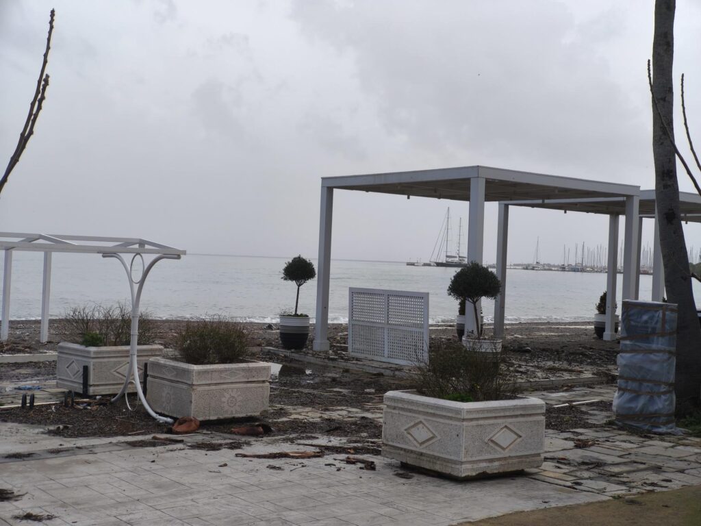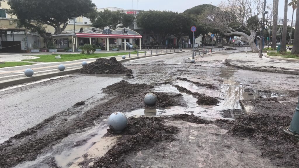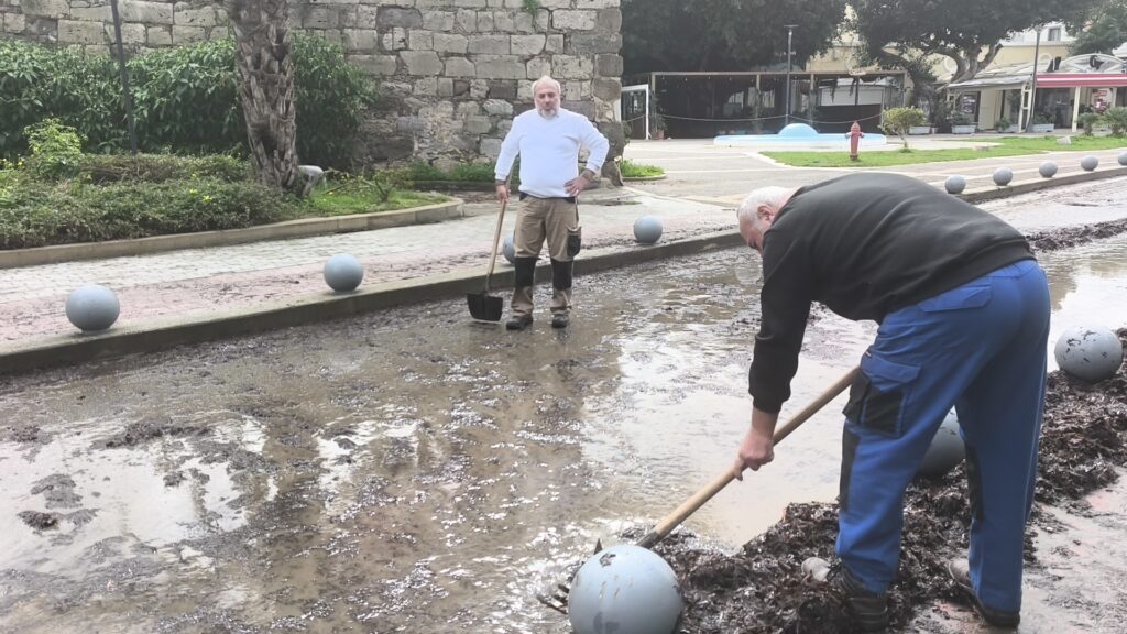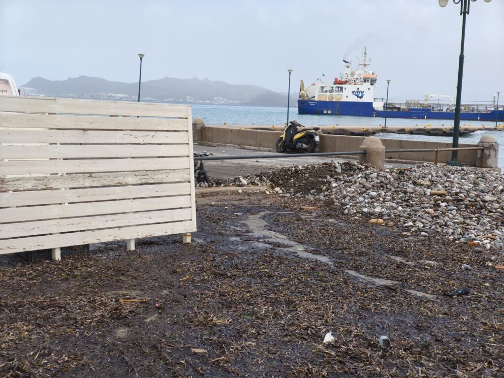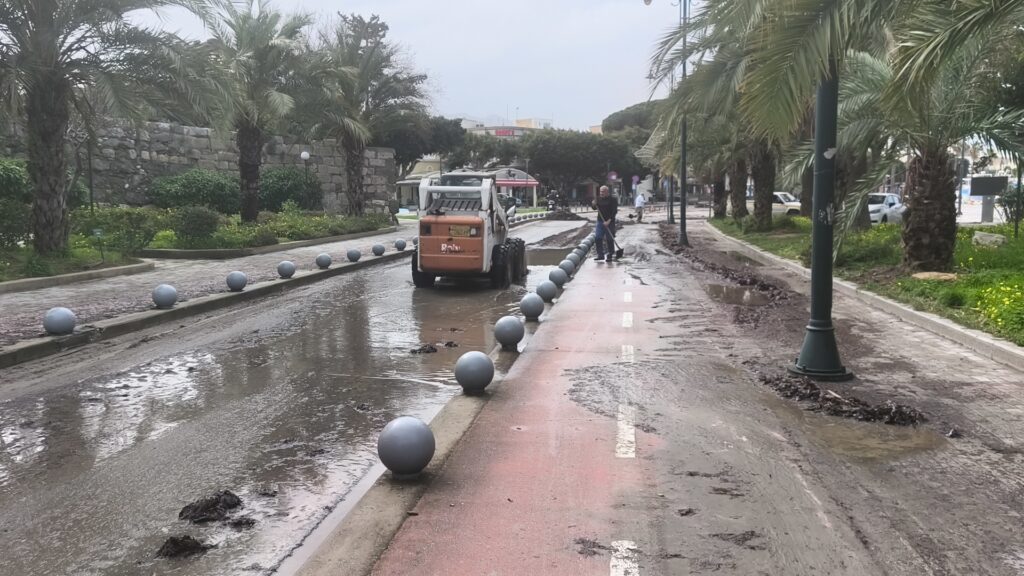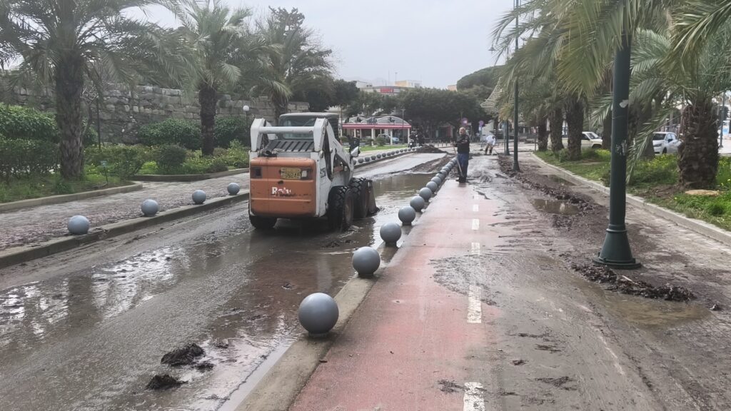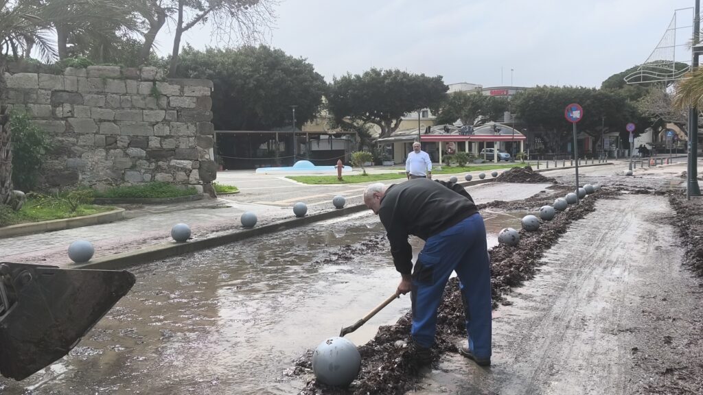 Οι θυελλώδεις άνεμοι μετέφεραν στη στεριά φερτά υλικά, με τα συνεργία να προσπαθούν να τα απομακρύνουν για να επιτραπεί και πάλι η διέλευση πεζών και οχημάτων στην περιοχή.