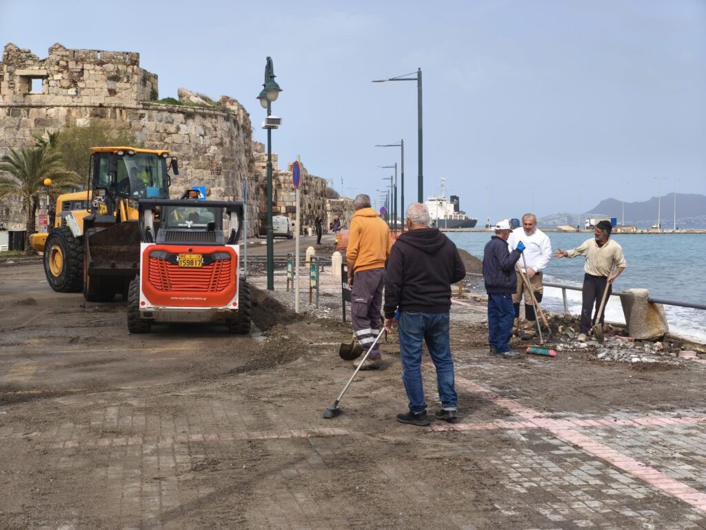 Από τις πρώτες πρωινές ώρες της Δευτέρας , μηχανήματα και συνεργεία του Δήμου επιχειρούν στα σημεία που επλήγησαν, προκειμένου να καθαριστούν δρόμοι και κοινόχρηστοι χώροι, καθώς αναμενόταν και η προσέγγιση του πλοίου της γραμμής στο λιμάνι της Κω.