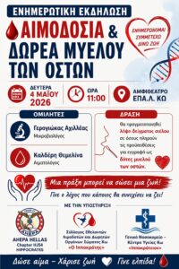 Ενημερωτική εκδήλωση για την Εθελοντική Αιμοδοσία και τη Δωρεά Μυελού των Οστών στο ΕΠΑΛ Κω Το ΕΠΑΛ Κω διοργανώνει ενημερωτική εκδήλωση τη Δευτέρα 4 Μαΐου 2026