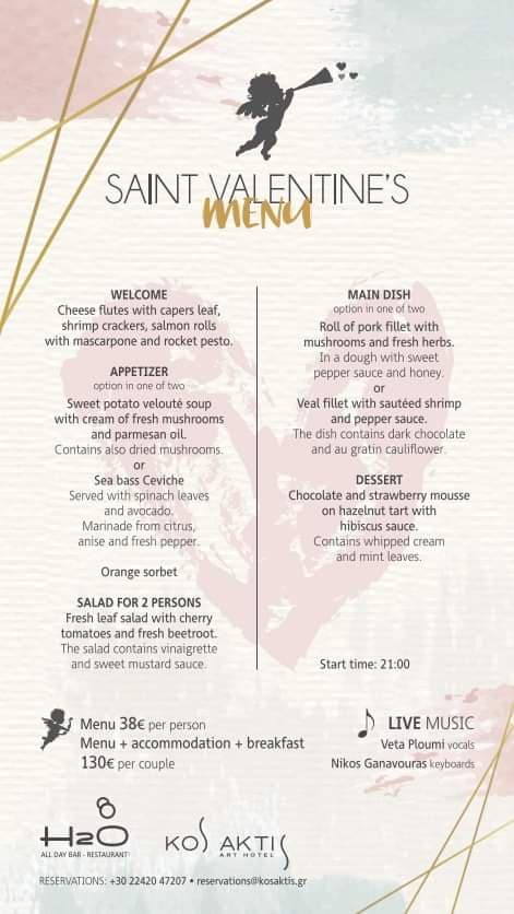 Για τη συγκεκριμένη μέρα υπάρχει και ειδικό πακέτο διαμονής μαζί με το μενού , τη διαμονή και το πρωινό της επόμενης μέρας. (130 ευρώ ανά ζευγάρι)