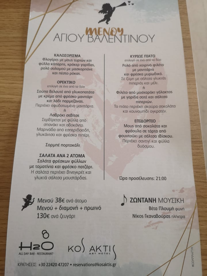Το  Kos Aktis γιορτάζει την ημέρα των ερωτευμένων με ένα ξεχωριστό μενού για δύο, στην ειδυλλιακή ατμόσφαιρα του H20 All Day Bar- Restaurant!