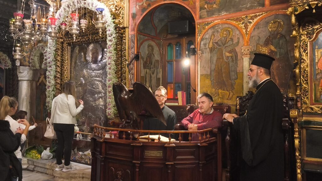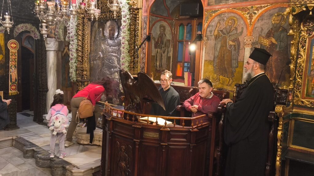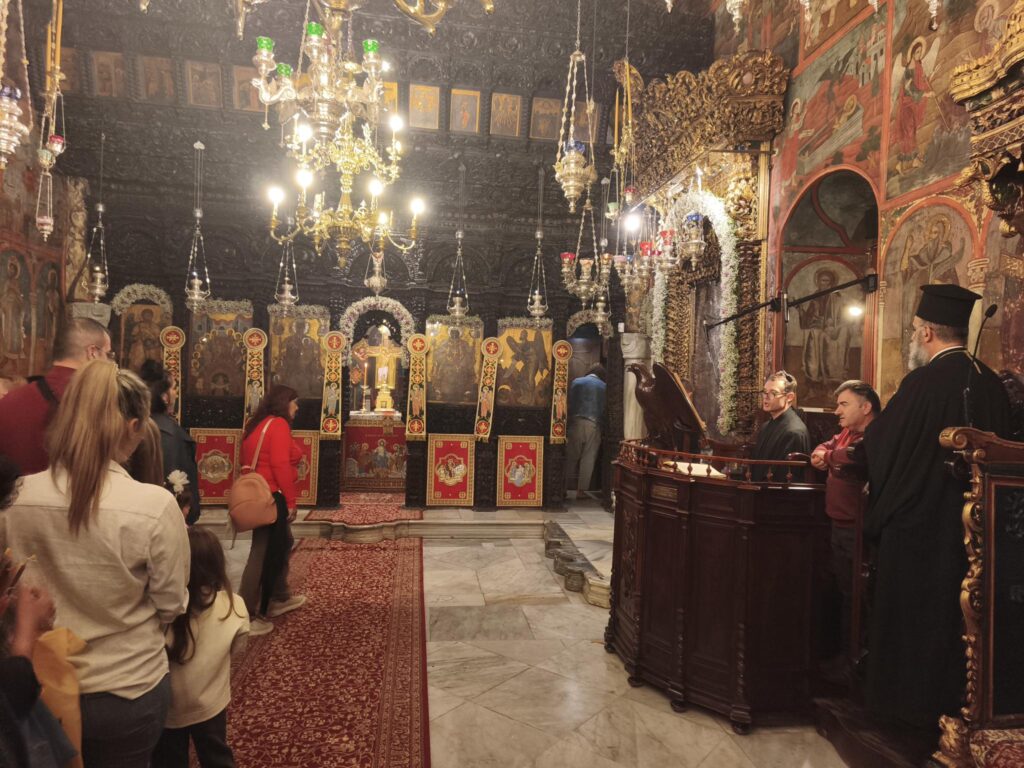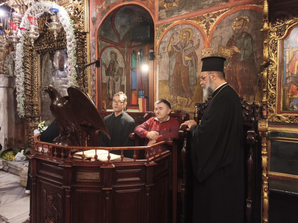 Το απόγευμα της παραμονής, ο Σεβασμιώτατος Μητροπολίτης κ. Χρυσόστομος χοροστάτησε στον Μέγα Πανηγυρικό Εσπερινό, έχοντας στο πλευρό του τον Πανοσιολογιώτατο Καθηγούμενο της Ιεράς Πατριαρχικής και Σταυροπηγιακής Μονής Ιβήρων του Αγίου Όρους, Αρχιμανδρίτη π. Ναθαναήλ, μέσα σε κλίμα βαθιάς κατάνυξης και πνευματικής ανάτασης.