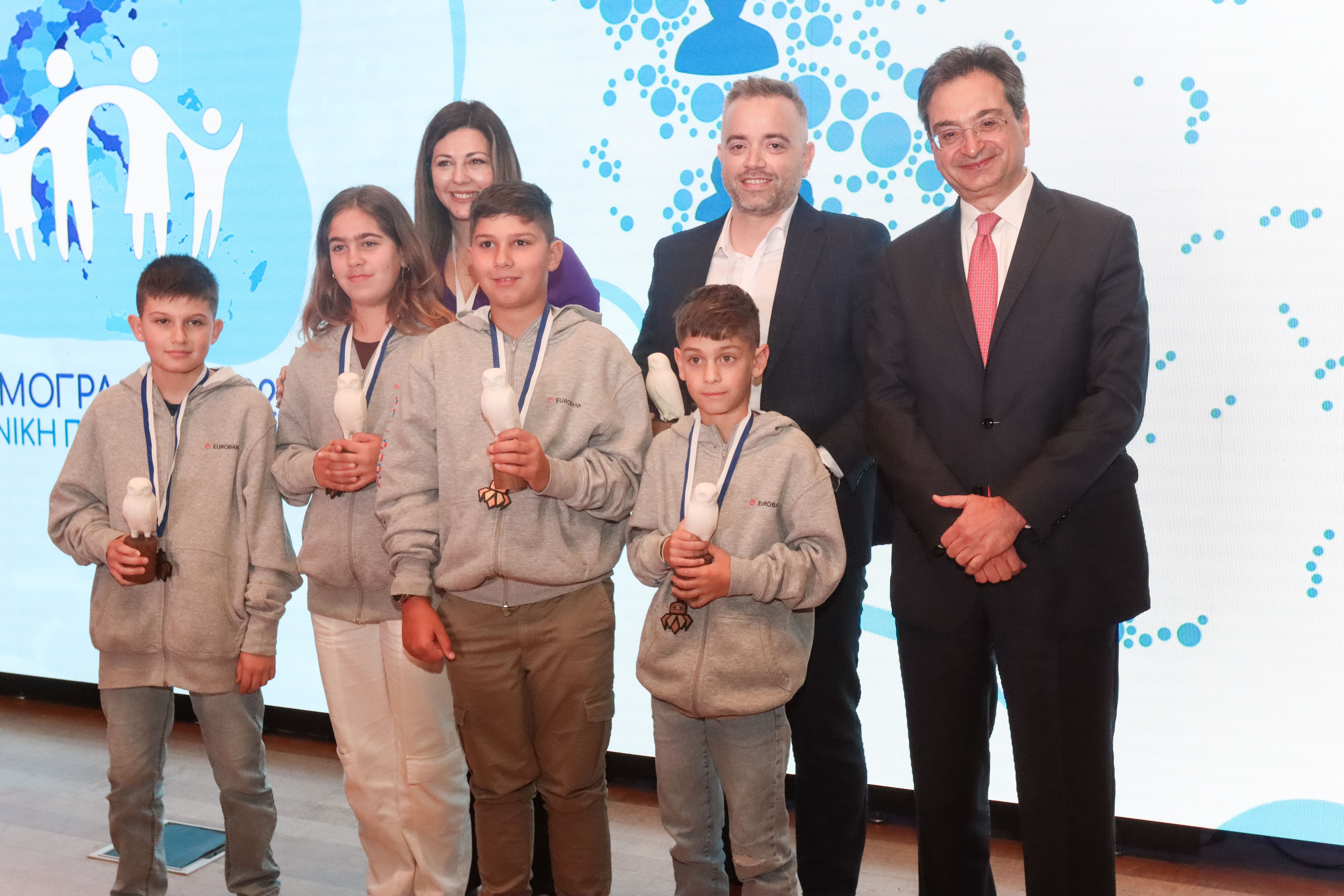 Ακολούθησε η βράβευση των μαθητών Δημοτικού της ομάδας ρομποτικής του ακριτικού νησιού του Αγίου Ευστρατίου, που συγκροτήθηκε από τον καθηγητή ρομποτικής, κ. Αντώνη Μακρή, στο πλαίσιο του προγράμματος της Eurobank Μπροστά για την Οικογένεια. Η ομάδα ρομποτικής συμμετείχε πρώτη φορά σε αγώνες και βραβεύθηκε, μεταξύ 11 χωρών, με το χρυσό μετάλλιο στο άθλημα της Τοξοβολίας, στην 3η Διεθνή Ολυμπιάδα Ρομποτικής, που διεξήχθη στην Κρήτη. Η βράβευση πραγματοποιήθηκε από την Υπουργό Κοινωνικής Συνοχής & Οικογένειας, κα Σοφία Ζαχαράκη και τον Διευθύνοντα Σύμβουλο της Eurobank, κ. Φωκίωνα Καραβία.