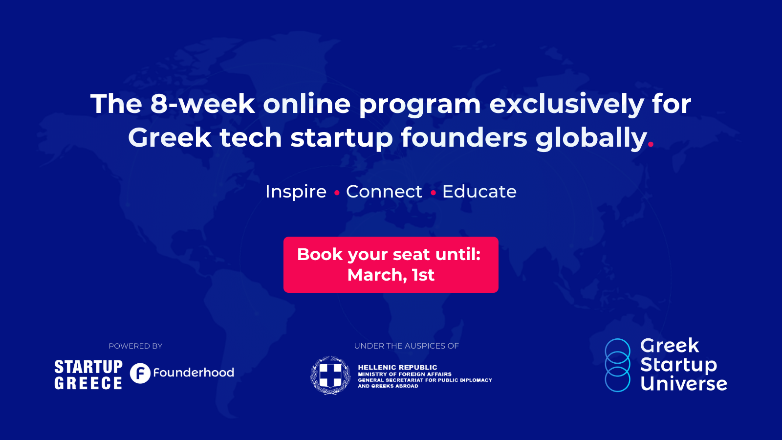 Η Γενική Γραµµατεία Δημόσιας Διπλωματίας και Απόδηµου Ελληνισµού του Υπουργείου Εξωτερικών είναι στην ευχάριστη θέση να ανακοινώσει την έναρξη του διαδικτυακού προγράµµατος Greek Startup Universe στις 2 Μαρτίου 2021, που πραγματοποιείται από τον μη κερδοσκοπικό οργανισμό StartupGreece και Founderhood. Το πρόγραµµα είναι δωρεάν για όλους τους Έλληνες και Κύπριους που έχουν µια τεχνολογική νεοφυή επιχείρηση ή ιδέα που υπόσχεται να αλλάξει τον κόσµο.