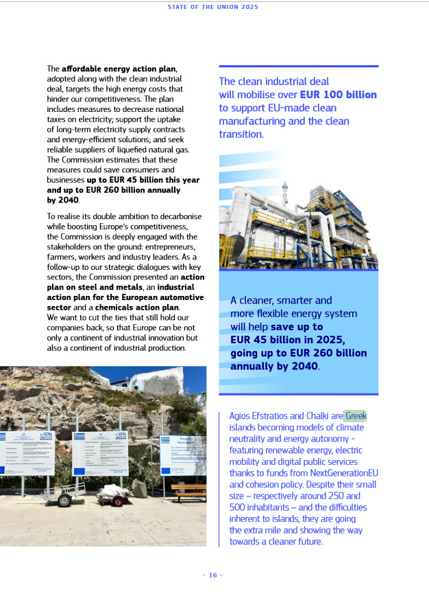 Στην επίσημη έκθεση απολογισμού της Ευρωπαϊκής Επιτροπής για τους πρώτους μήνες της νέας θητείας της, που παρουσιάστηκε ενόψει της Ομιλίας για την Κατάσταση της Ένωσης (SOTEU), γίνεται ειδική αναφορά στο νησί της Χάλκης ως νησί-πρότυπο κλιματικά ουδέτερης και ενεργειακά αυτόνομης ανάπτυξης, χάρη στην Πολιτική Συνοχής και το Ταμείο Ανάκαμψης και Ανθεκτικότητας της Ευρωπαϊκής Ένωσης.