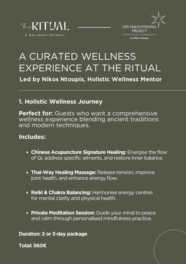 Κατά την άφιξή σας στο The Ritual, θα έχετε την ευκαιρία να γνωρίσετε προσωπικά τον Νίκο Ντούπη, να συζητήσετε τις ανάγκες σας και να σχεδιάσετε μαζί μια μοναδική διαδρομή ευεξίας προσαρμοσμένη αποκλειστικά σε εσάς.