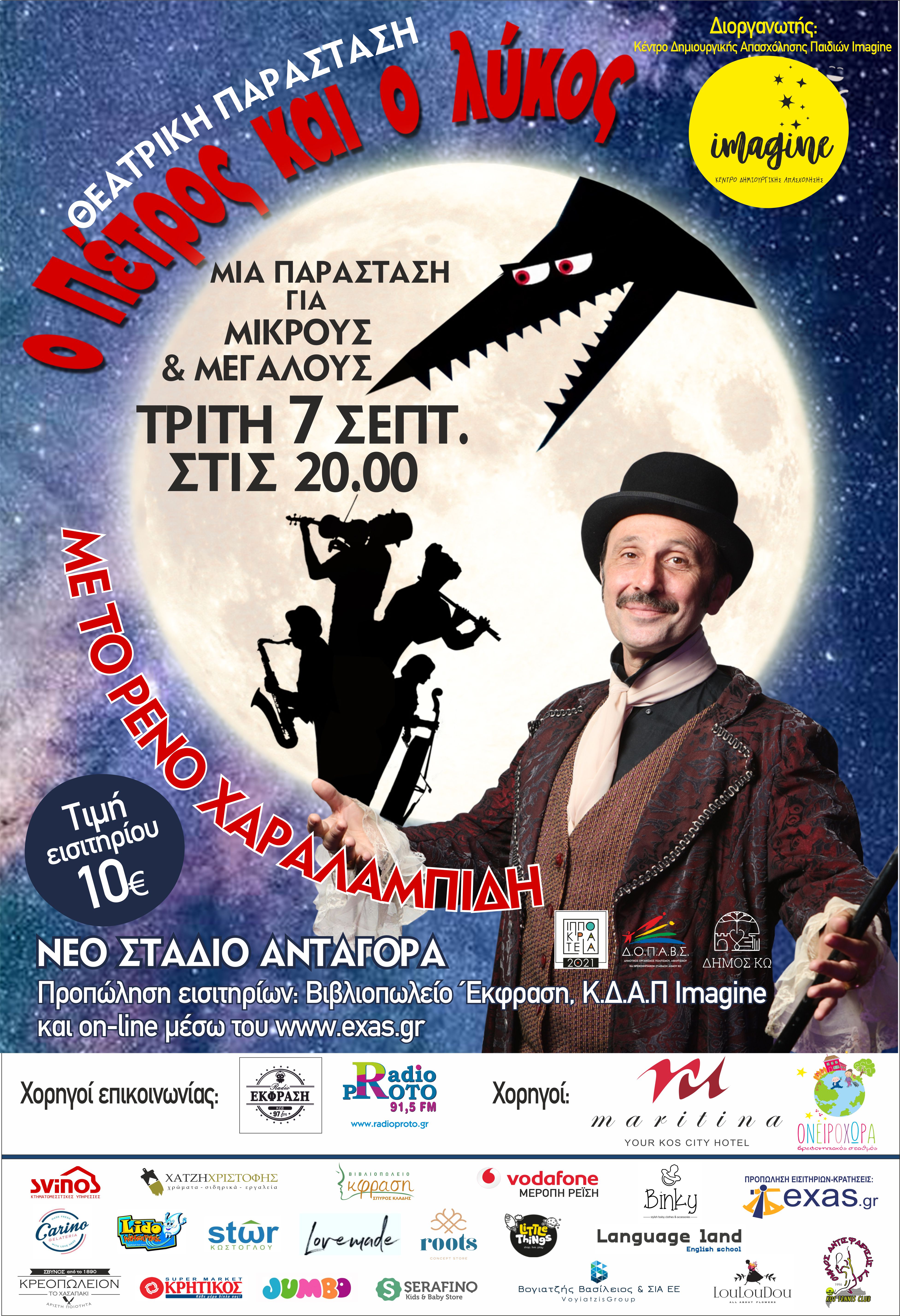 Το Κέντρο Δημιουργικής Απασχόλησης παιδιών “Imagine” με την συνδρομή του ΔΟΠΑΒΣ παρουσιάζει στη Κω την παιδική θεατρική παράσταση «Ο Πέτρος και ο Λύκος» με τον Ρένο Χαραλαμπίδη, την Τρίτη 07 Σεπτεμβρίου 2021 στις 20:00 στο Νέο Στάδιο Ανταγόρα στα πλαίσια των Θερινών Ιπποκρατείων 2021.