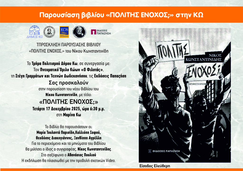 ΠΑΡΟΥΣΙΑΣΗ ΒΙΒΛΙΟΥ ΤΟΥ ΝΙΚΟΥ ΚΩΝΣΤΑΝΤΙΝΙΔΗ με τίτλο: «ΠΟΛΙΤΗΣ ΕΝΟΧΟΣ» σε συνεργασία με τον Π.Ο. ΚΩΩΝ «Ο ΦΙΛΗΤΑΣ», τη ΣΤΕΓΗ ΓΡΑΜΜΑΤΩΝ ΚΑΙ ΤΕΧΝΩΝ ΔΩΔΕΚΑΝΗΣΟΥ, τις ΕΚΔΟΣΕΙΣ ΠΑΠΑΖΗΣΗ και τη ΜΑΡΙΝΑ ΚΩ