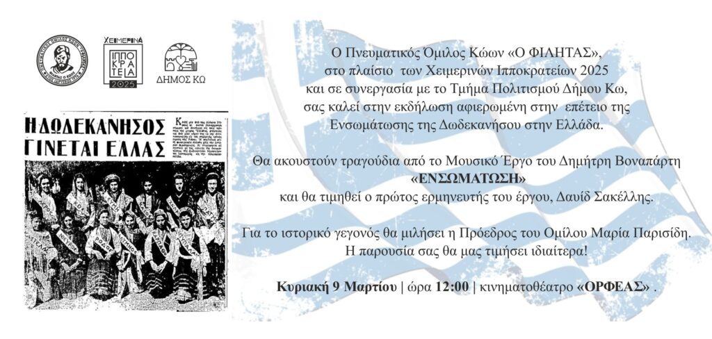 Στο πλαίσιο των Χειμερινών Πολιτιστικών Εκδηλώσεων «Ιπποκράτεια 2025» και με αφορμή τον εορτασμό της επετείου της 7ης Μαρτίου, το Τμήμα Πολιτισμού Δήμου Κω σας ενημερώνει:
