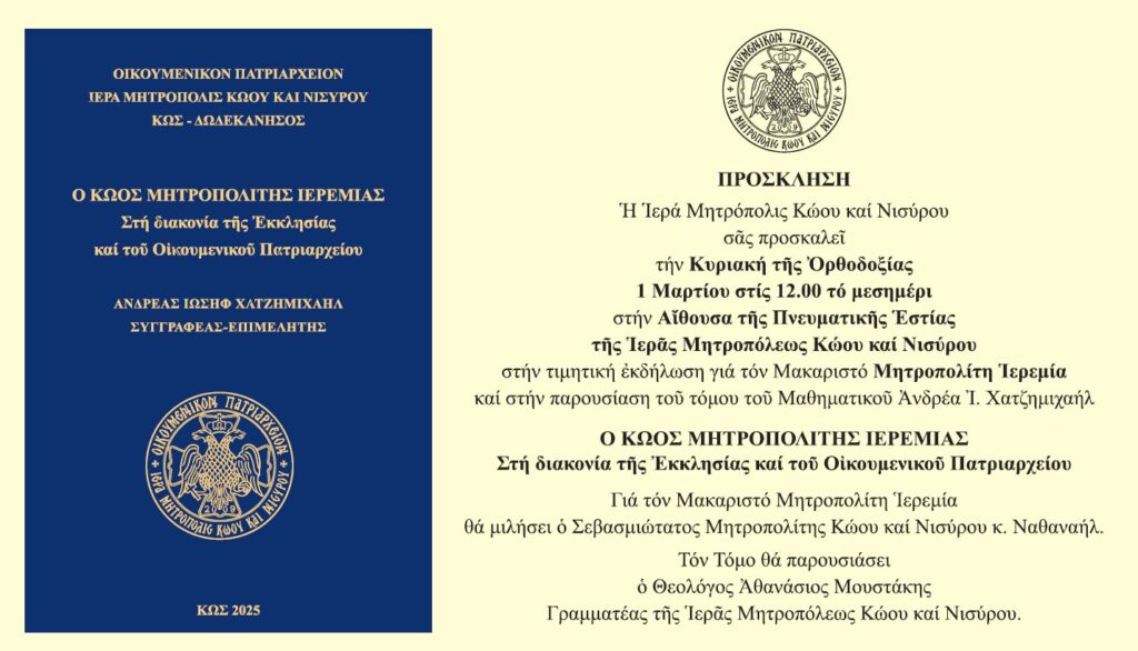 Ἡ Ἱερά Μητρόπολις Κώου καί Νισύρου σᾶς προσκαλεῖ τήν Κυριακή τῆς Ὀρθοδοξίας 1 Μαρτίου στίς 12.00 τό μεσημέρι στήν Αἴθουσα τῆς Πνευματικῆς Ἑστίας τῆς Ἱερᾶς Μητροπόλεως Κώου καί Νισύρου στήν τιμητική ἐκδήλωση γιά τόν Μακαριστό Μητροπολίτη Ἱερεμία καί στήν παρουσίαση τοῦ τόμου τοῦ Μαθηματικοῦ Ἀνδρέα Ἰ. Χατζημιχαήλ.