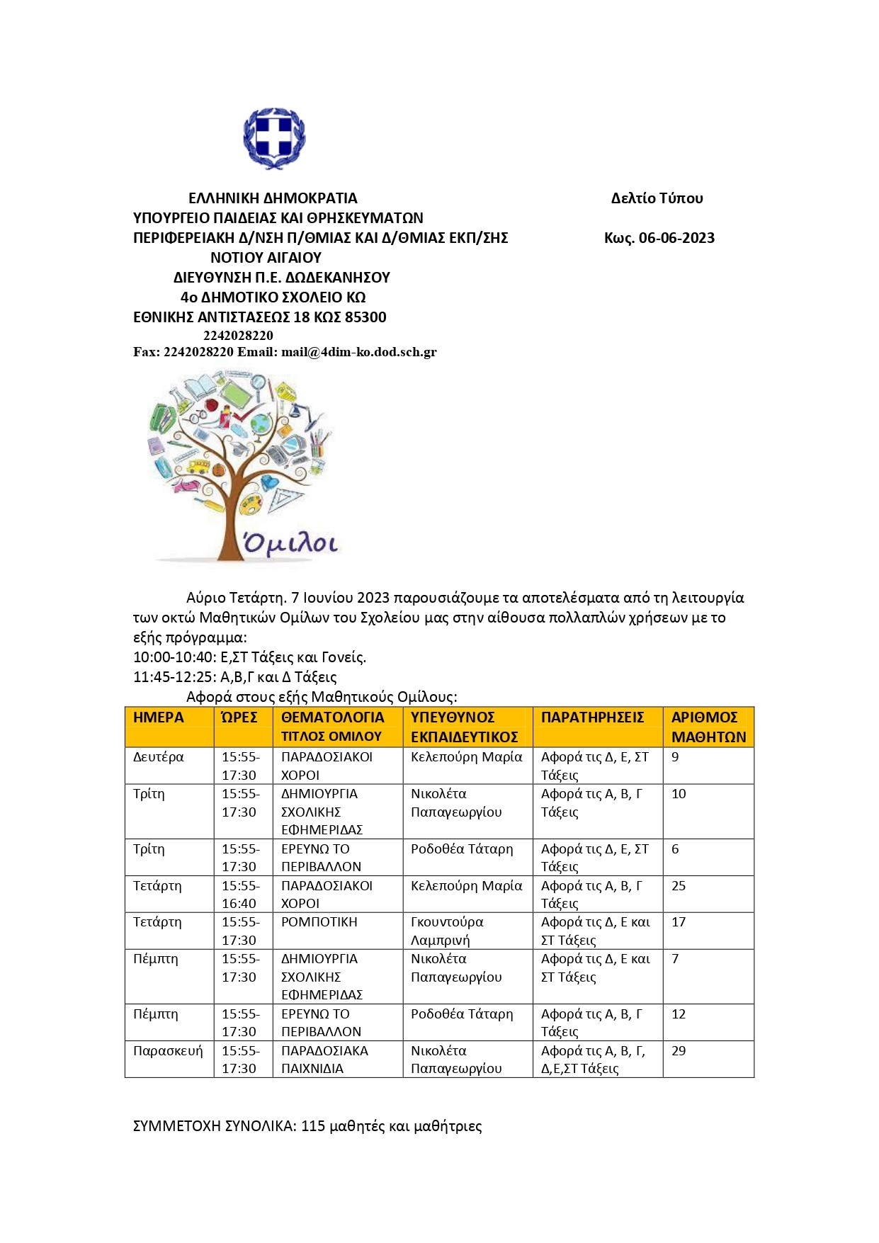 Αύριο Τετάρτη. 7 Ιουνίου 2023 παρουσιάζουμε τα αποτελέσματα από τη λειτουργία των οκτώ Μαθητικών Ομίλων του Σχολείου μας στην αίθουσα πολλαπλών χρήσεων με το εξής πρόγραμμα: