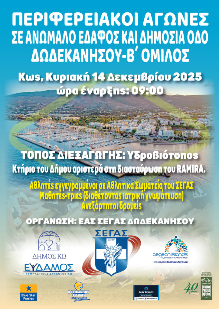 Την Κυριακή 14 Δεκεμβρίου 2025, η Κως θα φιλοξενήσει τους Περιφερειακούς Αγώνες σε Ανώμαλο Έδαφος και Δημόσια Οδό Δωδεκανήσου – Β΄ Ομίλου, με ώρα έναρξης τις 09:00. Η σημαντική αυτή αθλητική διοργάνωση θα πραγματοποιηθεί στον Υδροβιότοπο, στο κτήριο του Δήμου που βρίσκεται αριστερά στη διασταύρωση του RAMIRA.