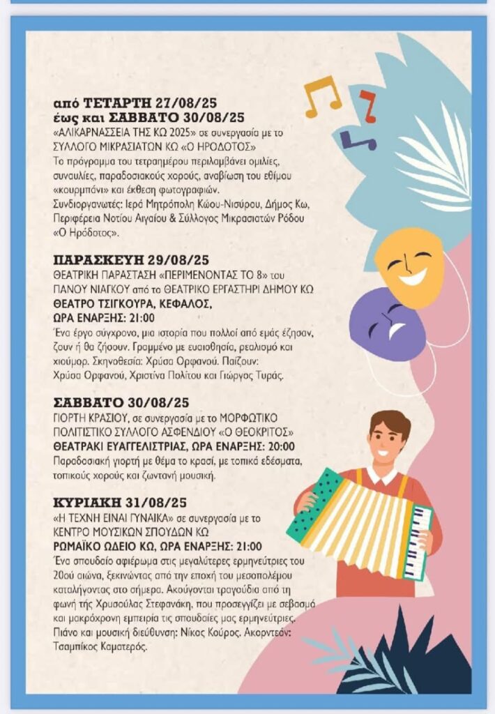 Στο πλαίσιο των θερινών πολιτιστικών εκδηλώσεων «Ιπποκράτεια 2025» το Τμήμα Πολιτισμού Δήμου Κω σας ενημερώνει για τις προσεχείς εκδηλώσεις: