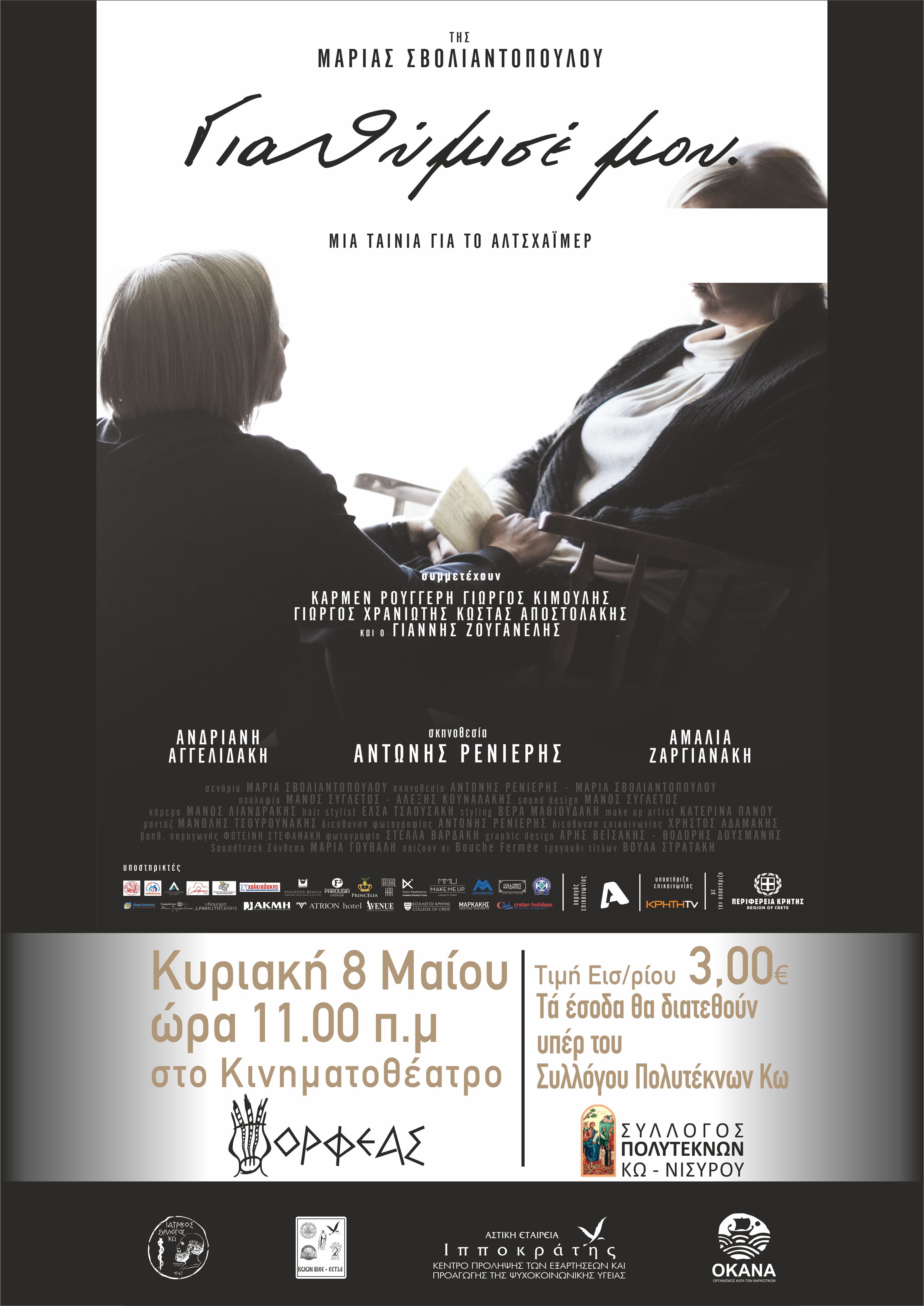 Ο Ιατρικός Σύλλογος Κω “O Ιπποκράτης”, η Αστική Εταιρεία “Ιπποκράτης”/Κέντρο Πρόληψης των Εξαρτήσεων και Προαγωγής της Ψυχοκοινωνικής Υγείας και ο Σύλλογος Πολυτέκνων Κω-Νισύρου, σας προσκαλούν στην προβολή ταινίας με τίτλο: “Για θύμισέ μου”. Μια ταινία αφιερωμένη στη νόσο Αλτσχάϊμερ, της κυρίας Μαρίας Σβολιαντοπούλου.