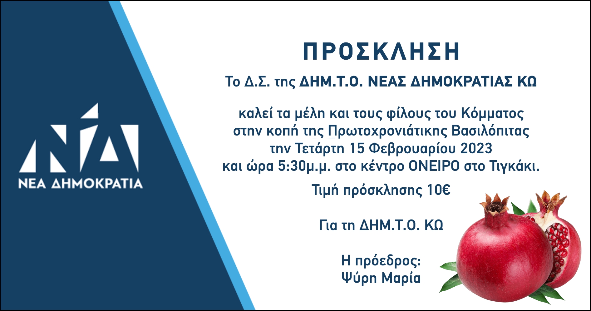 ΠΡΟΣΚΛΗΣΗ ΤΗΣ ΔΗΜ.Τ.Ο ΝΕΑΣ ΔΗΜΟΚΡΑΤΙΑΣ ΚΩ ΓΙΑ ΤΗΝ ΚΟΠΗ ΒΑΣΙΛΟΠΙΤΑΣ