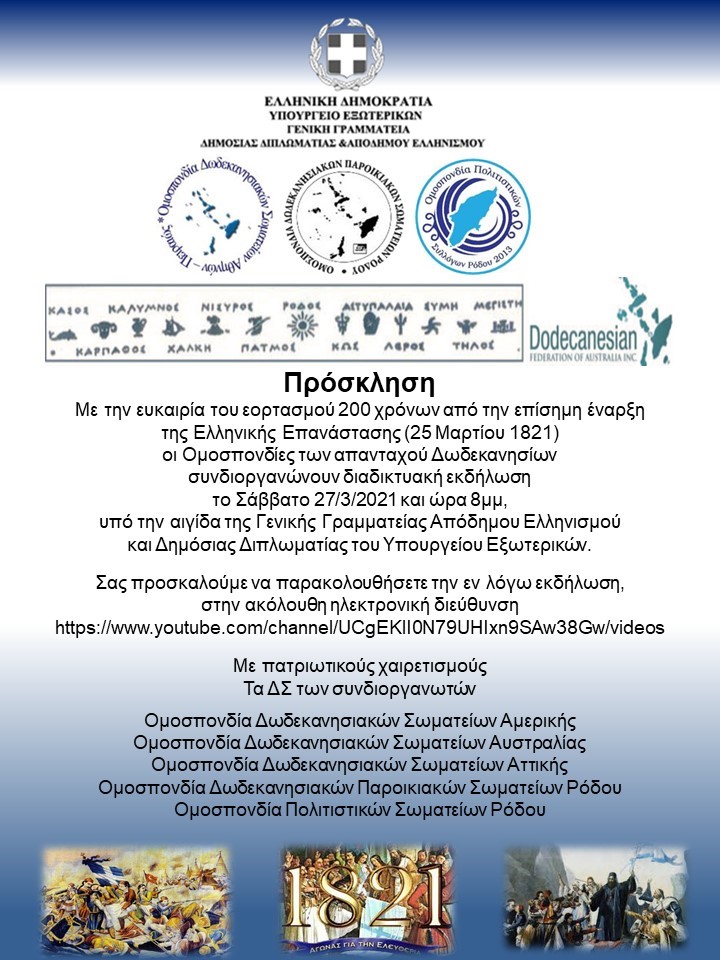Πρόσκληση Με την ευκαιρία του εορτασμού 200 χρόνων από την επίσημη έναρξη της Ελληνικής Επανάστασης (25 Μαρτίου 1821)