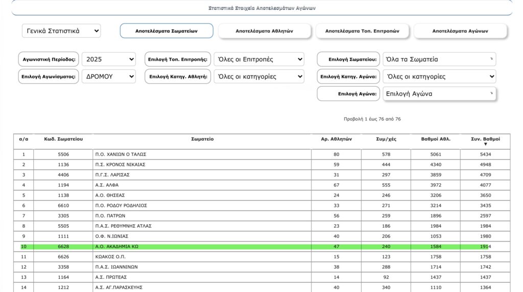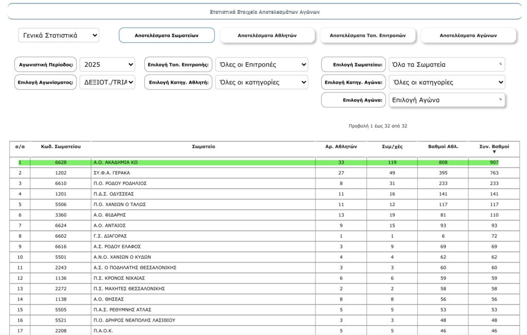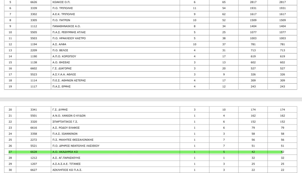 Χαρακτηριστικός είναι και ο αριθμός των αθλητών που συμμετείχαν σε αγώνες από κάθε σωματείο όπως φαίνεται στη γενική βαθμολογία, με την Ακαδημία Κω να είναι το 6ο σωματείο με τους περισσότερους αθλητές στην Ελλάδα. Λαμβάνοντας υπόψη τον μικρό πληθυσμό του νησιού μας, το να είναι βρίσκεται η Ακαδημία στην 6η θέση από πλευράς αριθμού αθλητών είναι ένα μεγάλο επίτευγμα, αποτέλεσμα της σπουδαίας δουλειάς που γίνεται από την προπονητική μας ομάδα και της αγάπης και μεγάλης ανταπόκρισης των συμπολιτών μας σε αυτό το σπουδαίο έργο που επιτελεί η ομάδα μας.