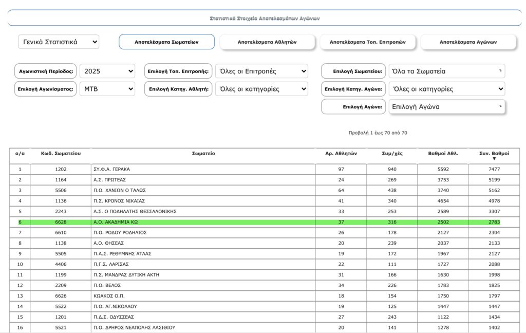 · Τη βαθμολογία στο αγώνισμα της ΟΡΕΙΝΗΣ ΠΟΔΗΛΑΣΙΑΣ, με την Ακαδημία να κατατάσσεται 6η