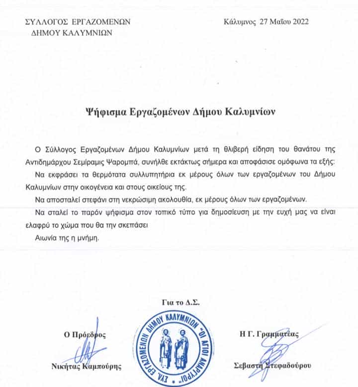 Συλλυπητήρια μηνύματα του πολιτικού κόσμου της Δωδεκανήσου και Σωματείων για τον θάνατο της Σεμίραμις Ψαρομπά