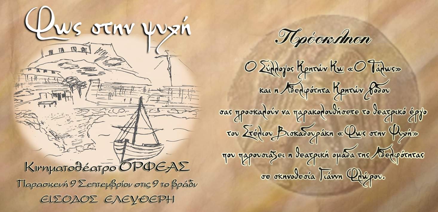 Μια παράσταση με το θεατρικό έργο του Στέλιου Βισκαδουράκη «Φως την ψυχή», θα παρουσιάσει η Θεατρική Ομάδα των Κρητών Ρόδου στην Κω την Παρασκευή 9 Σεπτεμβρίου στις εννέα το βράδυ στο Κινηματοθέατρο ΟΡΦΕΑΣ (χειμερινό) με ελεύθερη είσοδο για το κοινό.