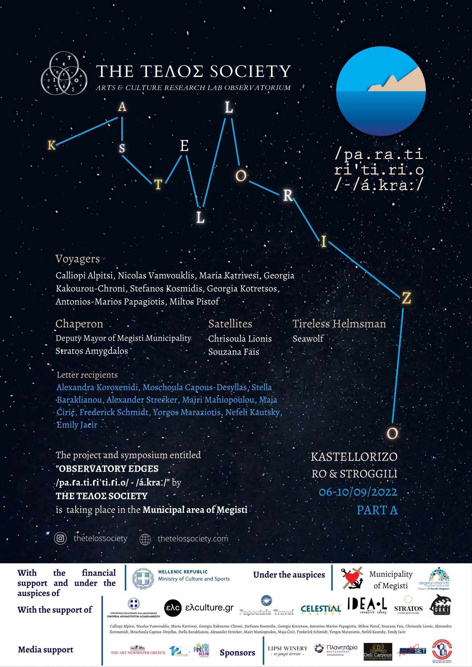 Η ιδρύτρια της ΤΗΕ ΤΕΛΟΣ SOCIETY, και καλλιτεχνική διευθύντρια της δράσης, Γεωργία Κοτρέτσος έχει προσκαλέσει μια διεπιστημονική ομάδα δέκα ατόμων από το χώρο του πολιτισμού που θα συμμετάσχουν σε μια σειρά ερευνητικών και πειραματικών ασκήσεων εστιάζοντας («παρατηρώντας») στο σύγχρονο πολιτισμό από το ανατολικότερο άκρο του τόπου μας, το ακριτικό Καστελλόριζο.