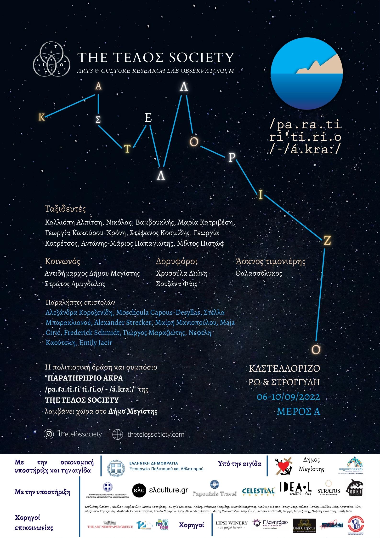 Το ΜΕΡΟΣ Α’ της πολιτισμικής δράσης που φέρει τον τίτλο «ΠΑΡΑΤΗΡΗΤΗΡΙΟ – ΑΚΡΑ | /pa.ɾa.ti.ɾiˈti.ɾi.o/ – /á.kraː/» της αστικής μη κερδοσκοπικής εταιρείας ΤΗΕ ΤΕΛΟΣ SOCIETY (ΤΤS) θα πραγματοποιηθεί στο Δήμο Μεγίστης από τις 6 έως και τις 10 Σεπτεμβρίου 2022.
