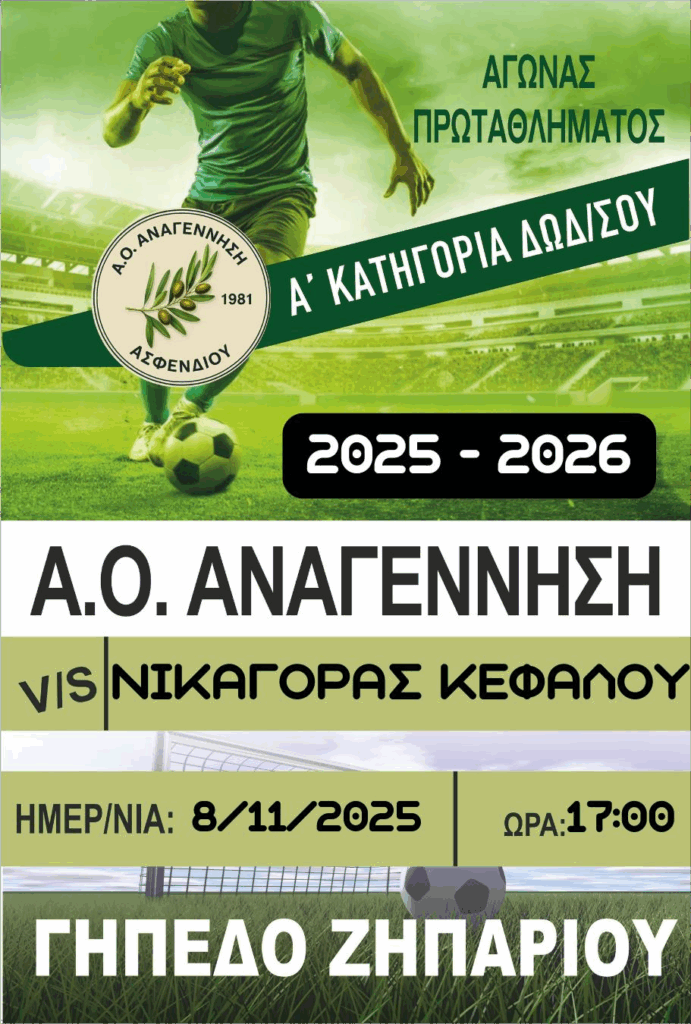 Τοπικό ντέρμπι το Σάββατο: Η Αναγέννηση Ασφενδιού υποδέχεται τον Νικαγόρα Κεφάλου για την 7η αγωνιστική της Α’ Κατηγορίας Δωδεκανήσου