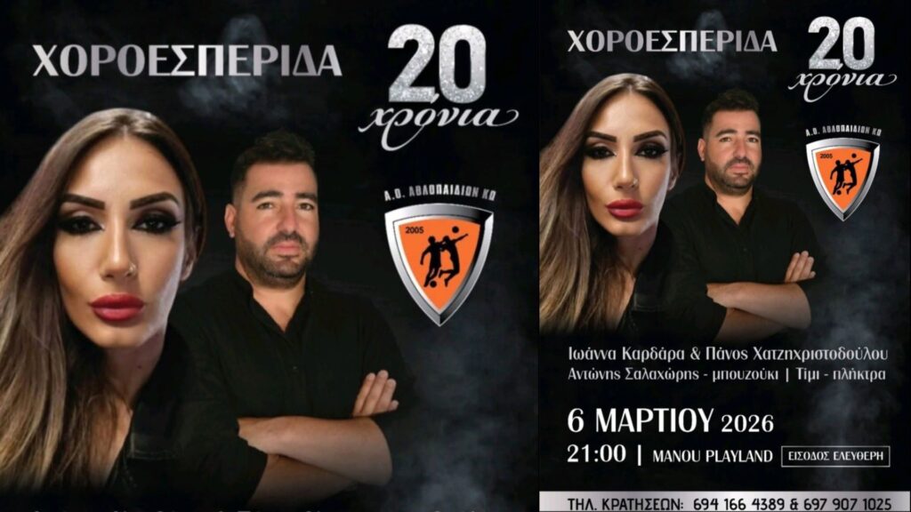 Ο Α.Ο. Αθλοπαιδιών Κω γιορτάζει φέτος 20 χρόνια παρουσίας στον αθλητισμό και προσκαλεί όλους τους φίλους του συλλόγου σε μια ξεχωριστή χοροεσπερίδα, την Παρασκευή 6 Μαρτίου 2026 στις 21:00, στο Manou Playland.