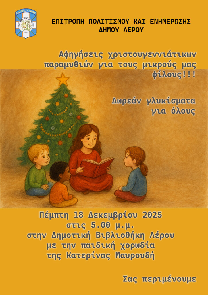 Μια ζεστή και γιορτινή εκδήλωση για τα παιδιά διοργανώνει η Επιτροπή Πολιτισμού και Ενημέρωσης του Δήμου Λέρου, προσκαλώντας τους μικρούς φίλους του νησιού σε ένα μαγικό απόγευμα αφιερωμένο στα χριστουγεννιάτικα παραμύθια.