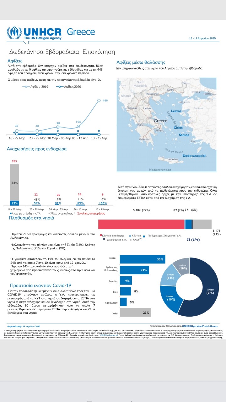 Αυτή την εβδομάδα, 8 αιτούντες ασύλου αναχώρησαν, έπειτα από σχετική έγκριση των αρχών, από τα Δωδεκάνησα προς την ενδοχώρα. Όλοι μεταφέρθηκαν από κρατικές αρχές με την υποστήριξη της Υ.Α. σε διαμερίσματα ΕΣΤΙΑ κάτω από της διαχείριση της Υ.Α. 5,402 (77%) 87 (1%) 371 (5%) . Περίπου 7,050 πρόσφυγες και αιτούντες ασύλου μένουν στα Δωδεκάνησα.
