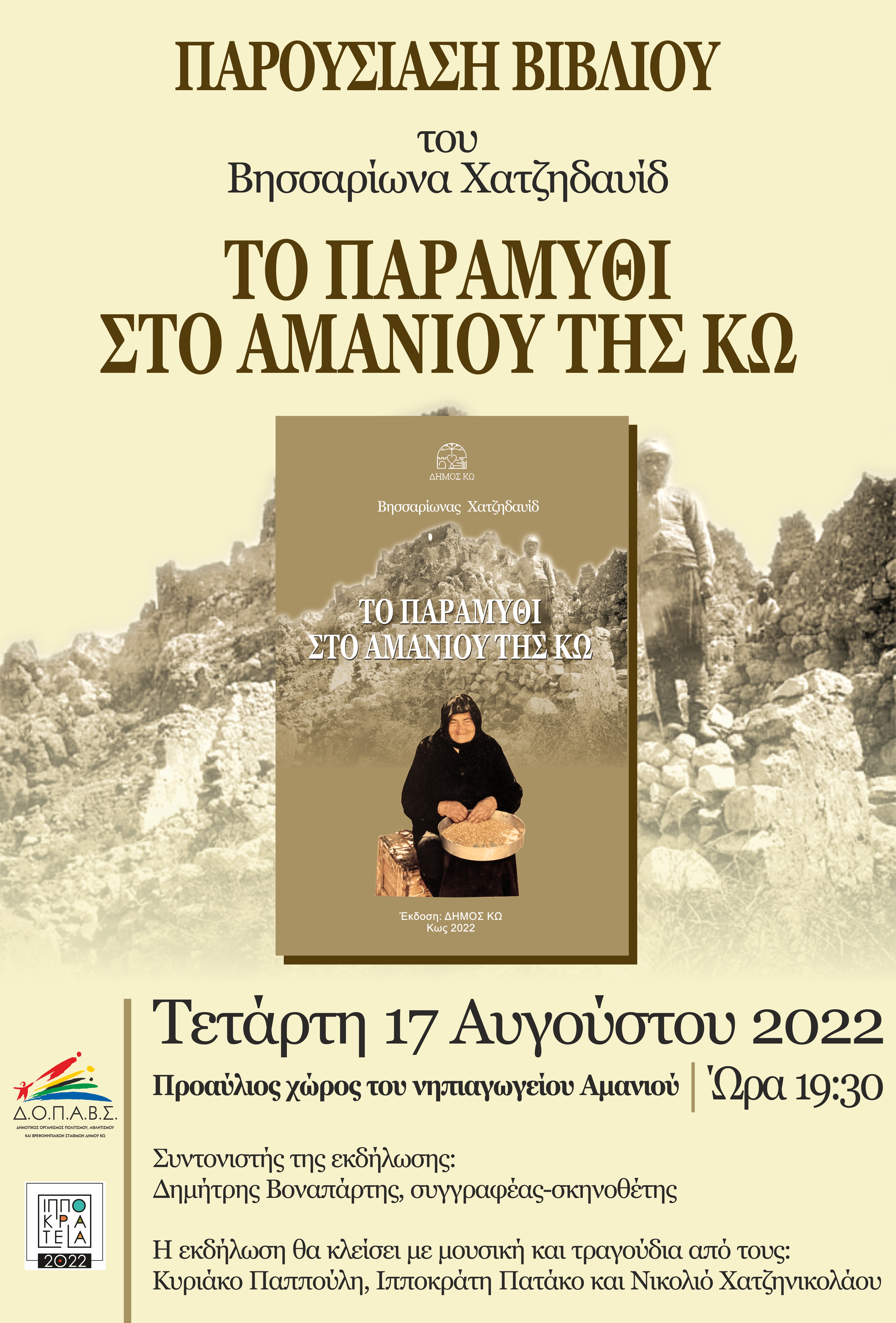 Ο ΔΟΠΑΒΣ στα πλαίσια των Θερινών Ιπποκρατείων 2022 διοργανώνει εκδήλωση για την παρουσίαση του βιβλίου του συμπατριώτη μας Βησσαρίωνα Χατζηδαυίδ με τίτλο « Το παραμύθι στο Αμανιού της Κω» την Τετάρτη 17 Αυγούστου στον Προαύλιο χώρο του Νηπιαγωγείου Αμανιού στις 19:30.