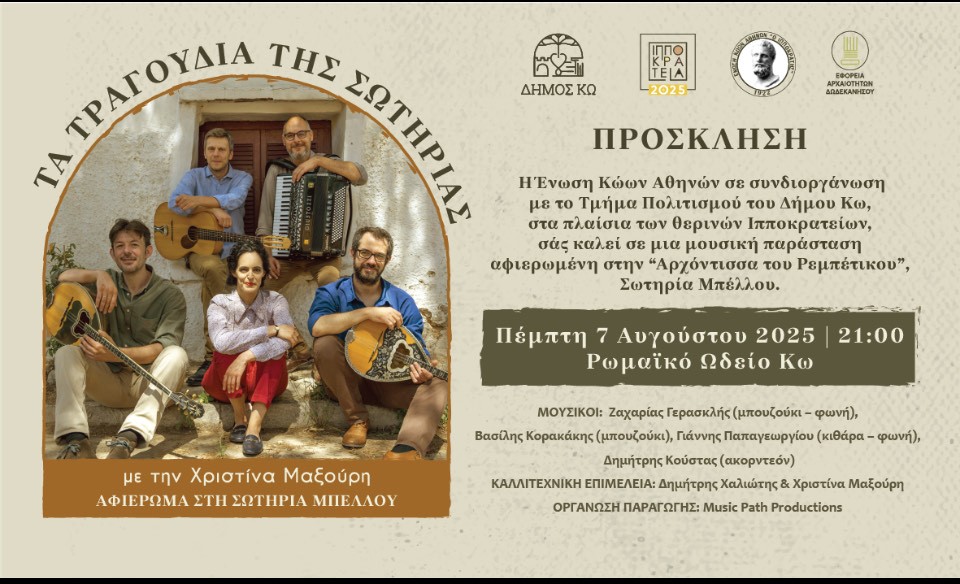 Τα Τραγούδια της Σωτηρίας – Μουσικό Αφιέρωμα στη Σωτηρία Μπέλλου στο Ρωμαϊκό Ωδείο Κω Η Ένωση Κώων Αθηνών, σε συνδιοργάνωση με το Τμήμα Πολιτισμού του Δήμου Κω, σας προσκαλεί σε μια ξεχωριστή μουσική βραδιά στο πλαίσιο των θερινών εκδηλώσεων «Ιπποκράτεια 2025». Την Πέμπτη 7 Αυγούστου 2025 και ώρα 21:00, στο Ρωμαϊκό Ωδείο της Κω, θα […]