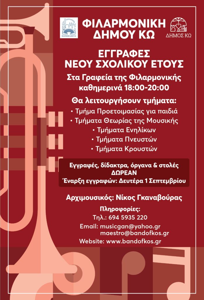 Έναρξη εγγραφών στη Φιλαρμονική του Δήμου Κω για το νέο σχολικό έτος Η Φιλαρμονική του Δήμου Κω ανακοινώνει την έναρξη των εγγραφών για το νέο σχολικό έτος. Οι εγγραφές πραγματοποιούνται καθημερινά, από τις 18:00 έως τις 20:00, στα γραφεία της Φιλαρμονικής. Θα λειτουργήσουν τα εξής τμήματα: Τμήμα Προετοιμασίας για παιδιά Τμήματα Θεωρίας της Μουσικής Τμήματα […]